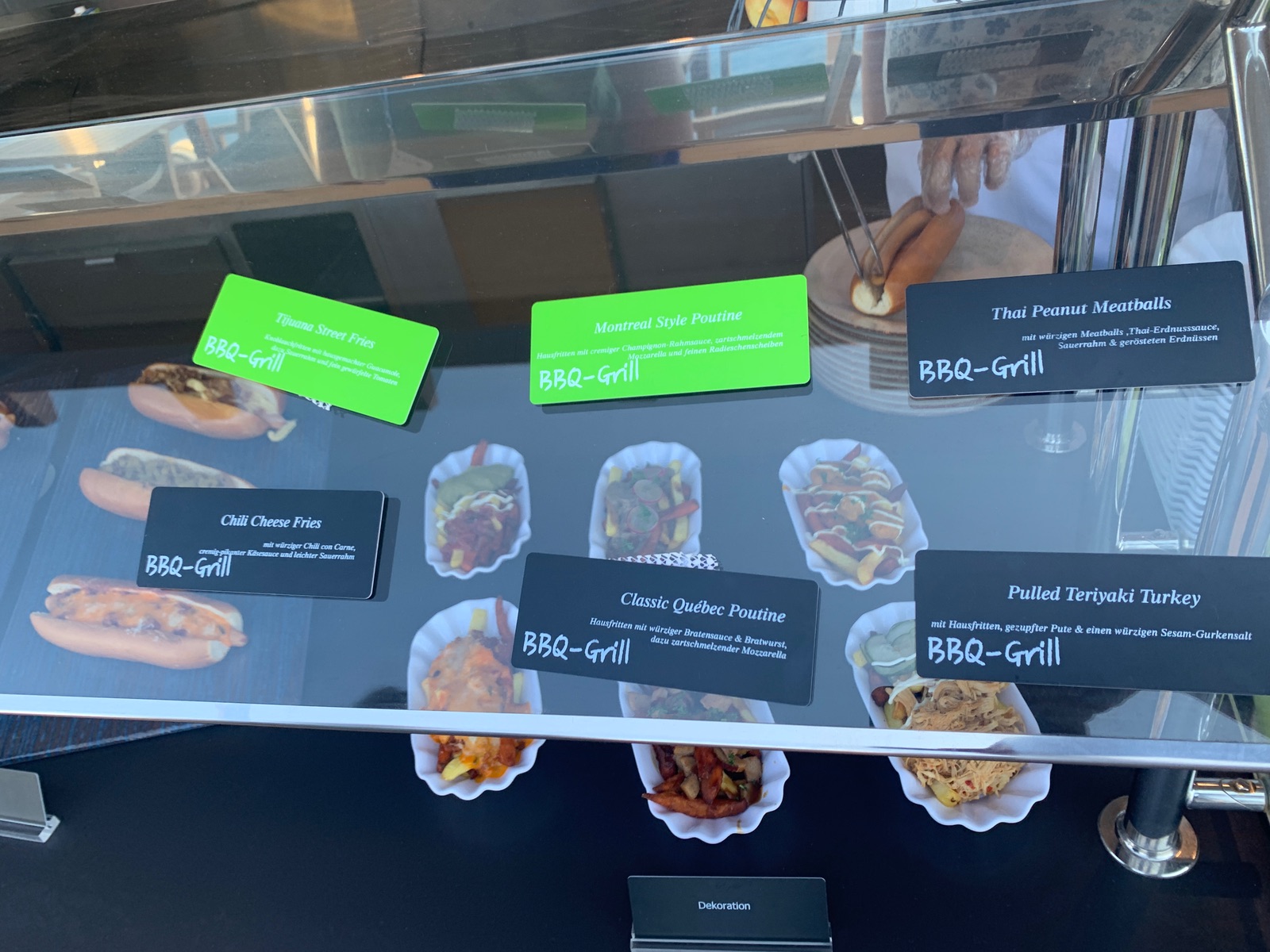 Auf der Nova gab es dort im März 2019 noch kleine Steaks und Grillwürstchen. Hat mir deutlich besser gefallen als Hotdog und Sättigungsbeilage...