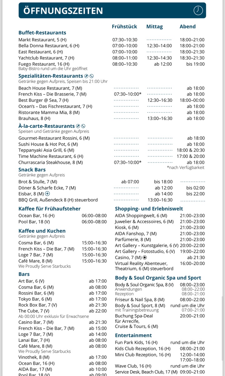 Gibt es eine aktuelle Übersicht, wie die Restaurants der Cosma an den See-und Landtagen in der Regel geöffnet haben ?