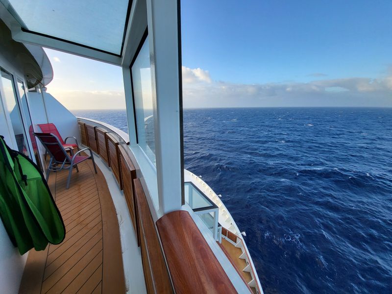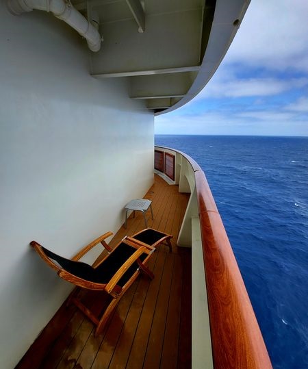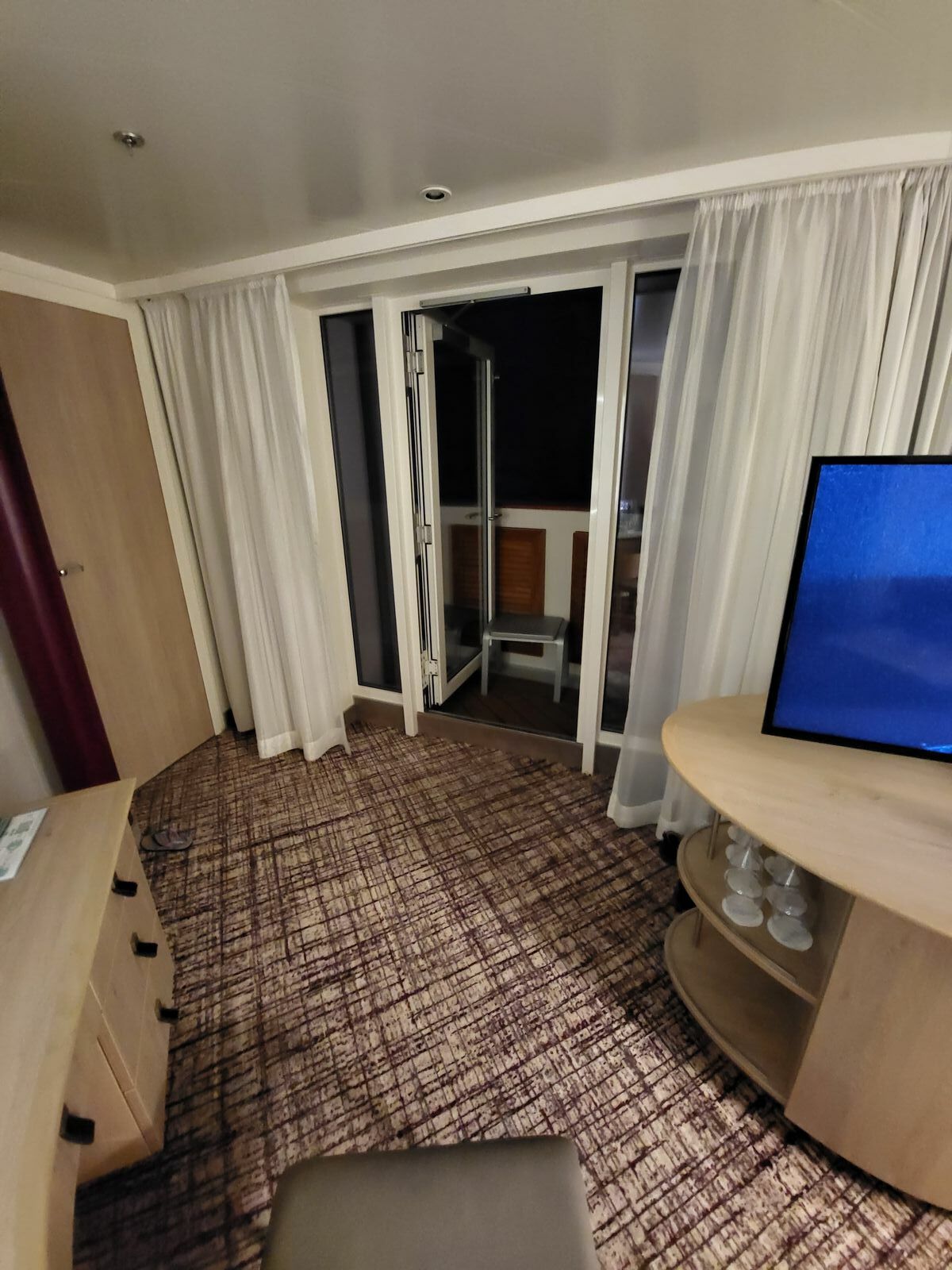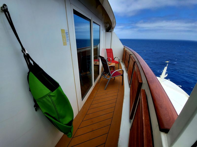 Perfekt eingerichtete Kabine mit perfektem Service, in der Tat ist der Balkon bei Fahrt nur bedingt nutzbar und die Tür bleibt nicht offen.