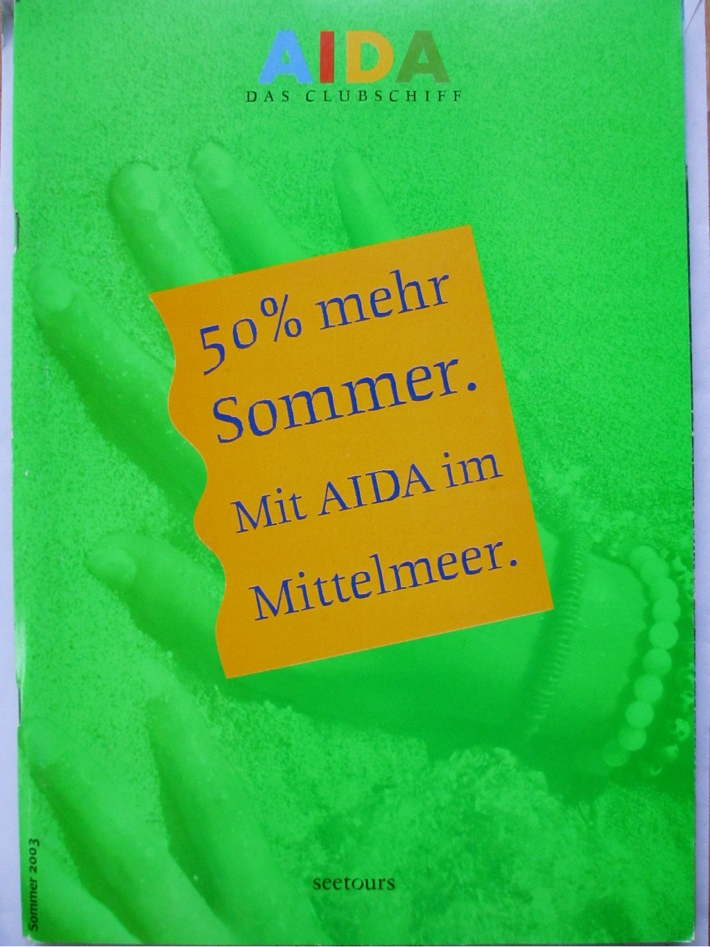 In den nostalgischen "AIDA-Katalogen" wurden die Kreuzfahrten noch sehr großflächig und sehr bunt mit Sonnenschirmen gezeigt