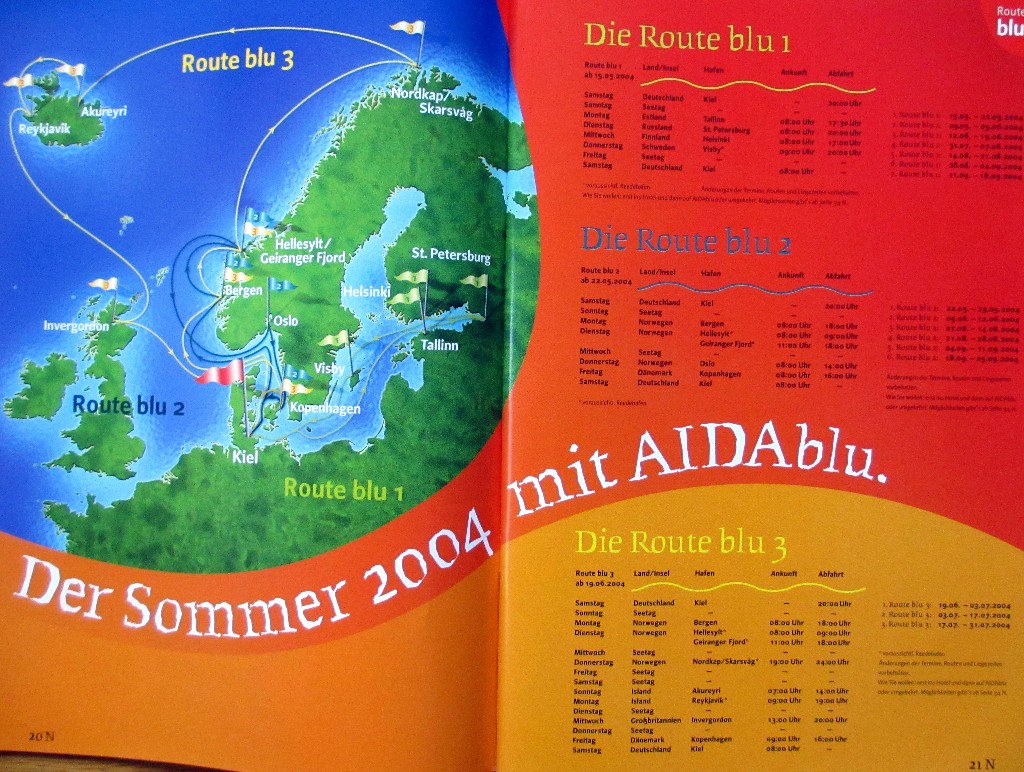 Hier gibt es jetzt ein nostalgisches Bild der "Vorderseite" vom "AIDA-Katalog" Sommer 2004,es gibt auch noch ein nostalgisches Bild der speziellen "Rückseite" vom "AIDA-Katalog" Sommer 2004 (siehe das 4.untere Bild)