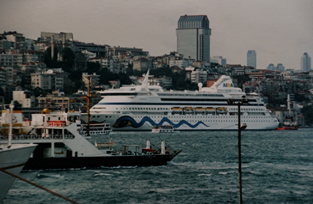 Die AIDAvita wird im Juli 2002 während ihrem Anlegemanöver in "Istanbul" mit "Wasserfontänen" begrüßt