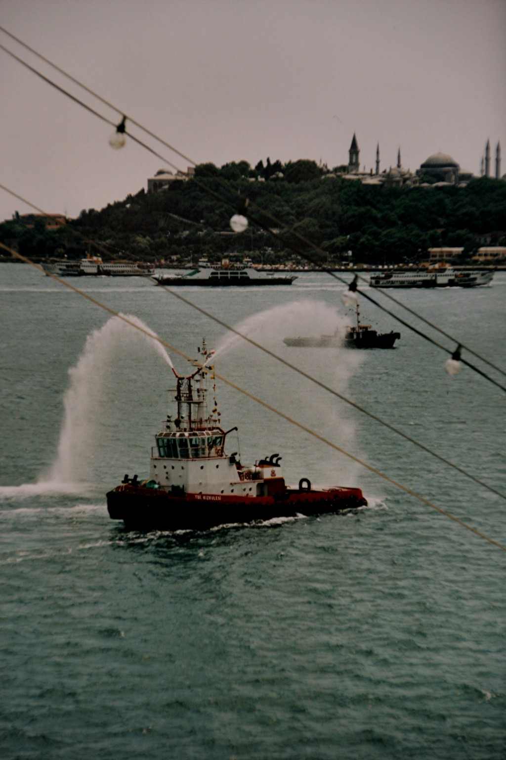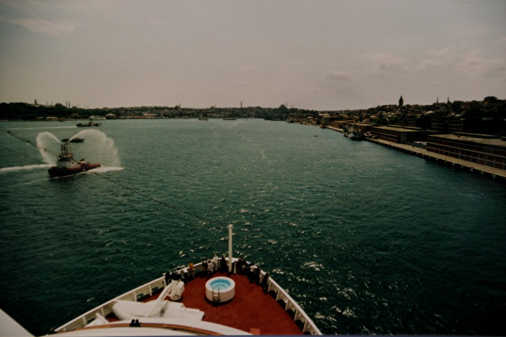 Die AIDAvita wird im Juli 2002 während ihrem Anlegemanöver in "Istanbul" mit "Wasserfontänen" begrüßt