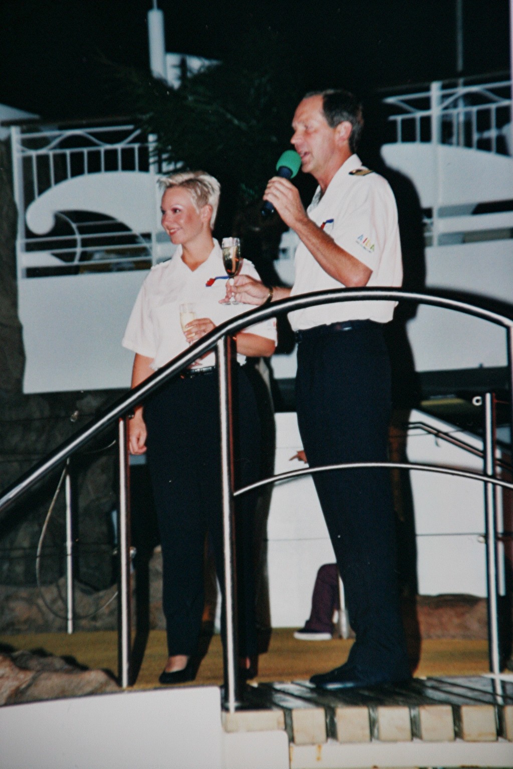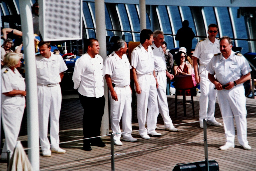Kapitän Hoppert kurz vor seiner Begrüßungsrede auf dem Pooldeck der "A'ROSA BLU" im März 2004