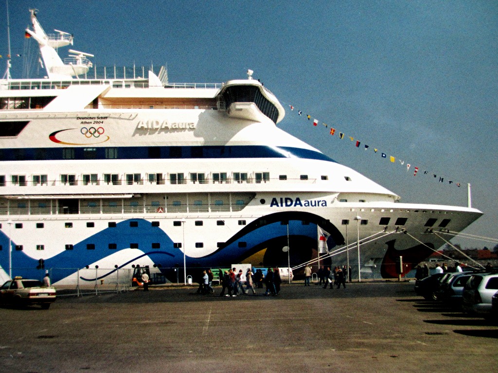 Passend zum Beitrag Nr.446 konnte man im April 2003 auch schon die "Olympischen Ringe" für die "Olympiade 2004 in Athen" an der AIDAaura sehen