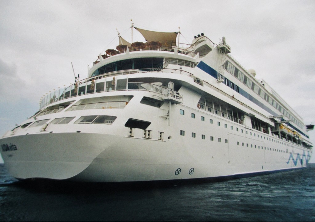 Panoramablick aus dem Tenderboot auf die AIDAvita an ihrem Liegeplatz auf "Reede" vor "Formentera"