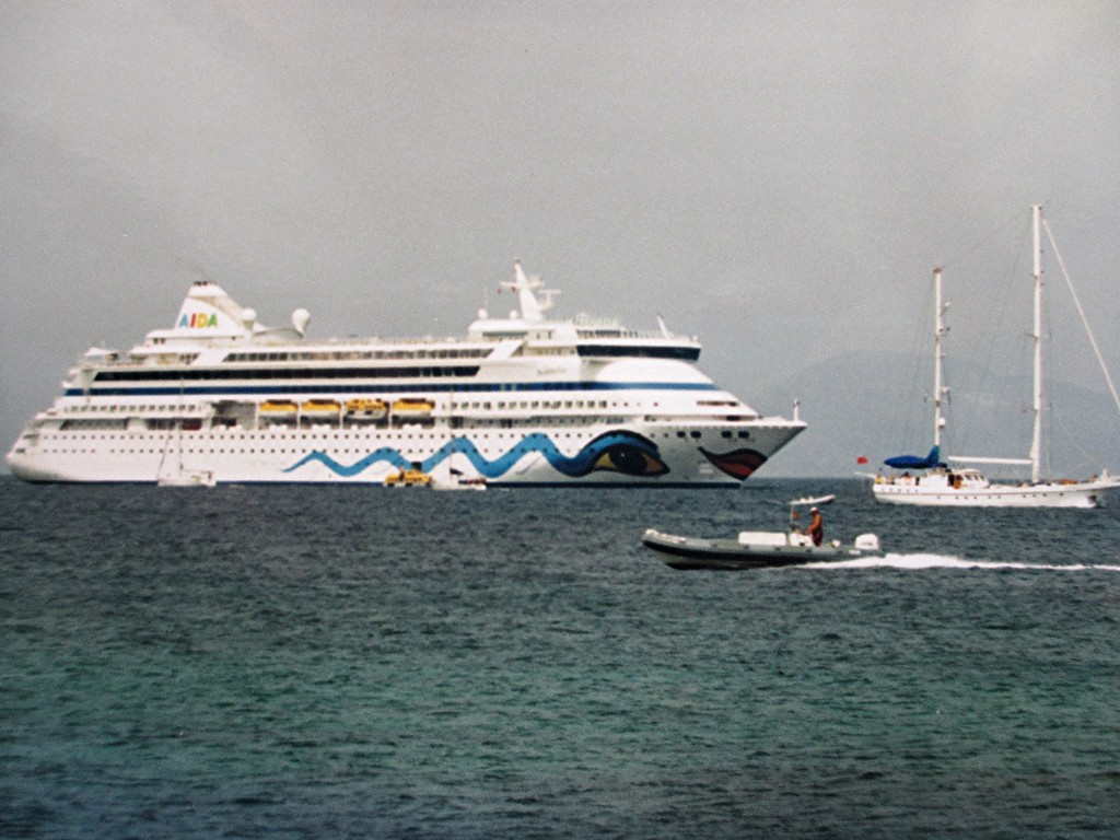 Panoramablick aus dem Tenderboot auf die AIDAvita an ihrem Liegeplatz auf "Reede" vor "Formentera"