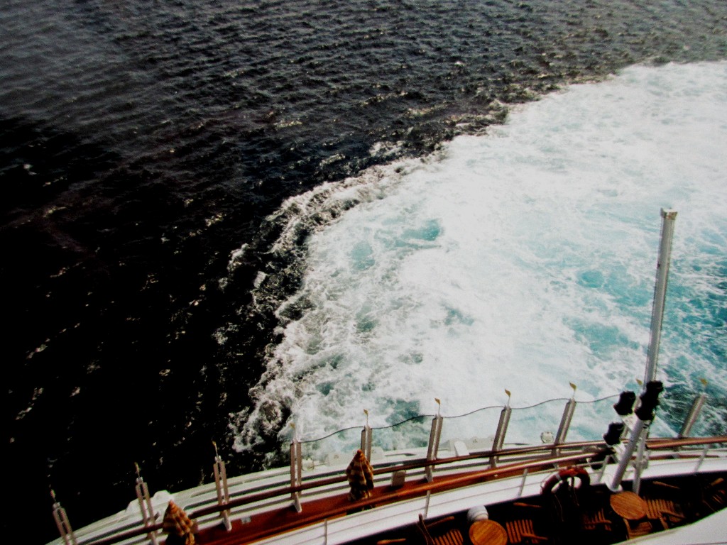 Die AIDAvita verläßt ihren Liegeplatz auf "Reede" vor der Insel "Formentera" mit einer starken Kursänderung