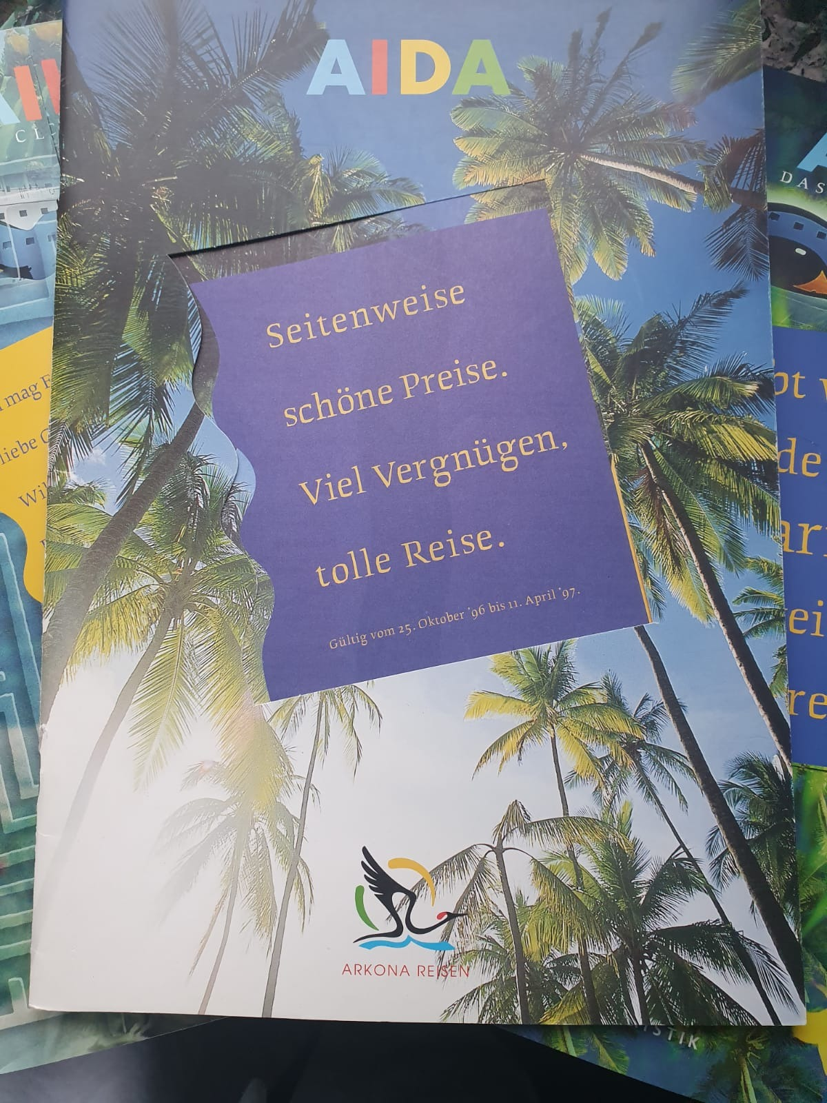 Hier gibt es jetzt ein nostalgisches Bild der "Vorderseite" vom "AIDA-Katalog" Sommer 2004,es gibt auch noch ein nostalgisches Bild der speziellen "Rückseite" vom "AIDA-Katalog" Sommer 2004 (siehe das 4.untere Bild)