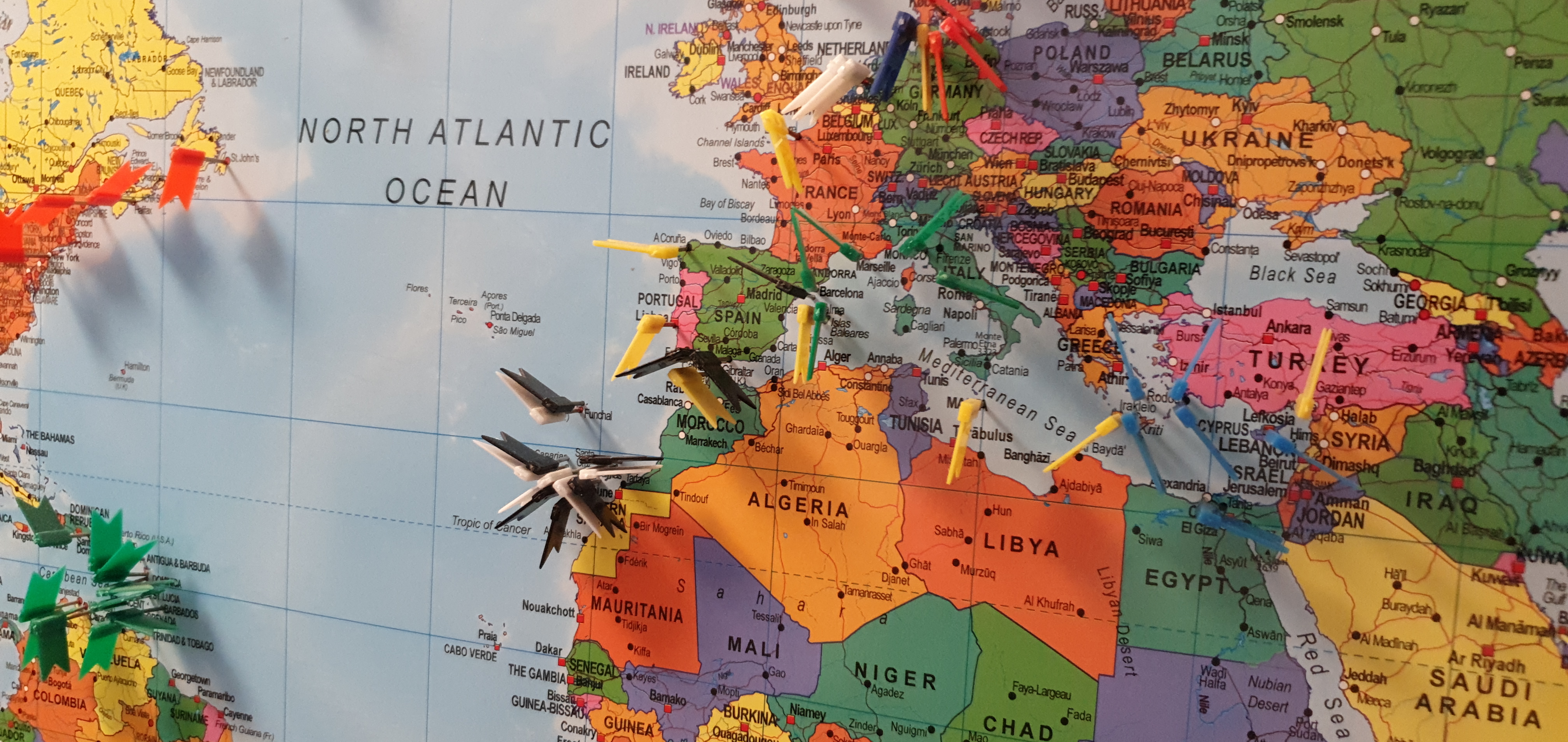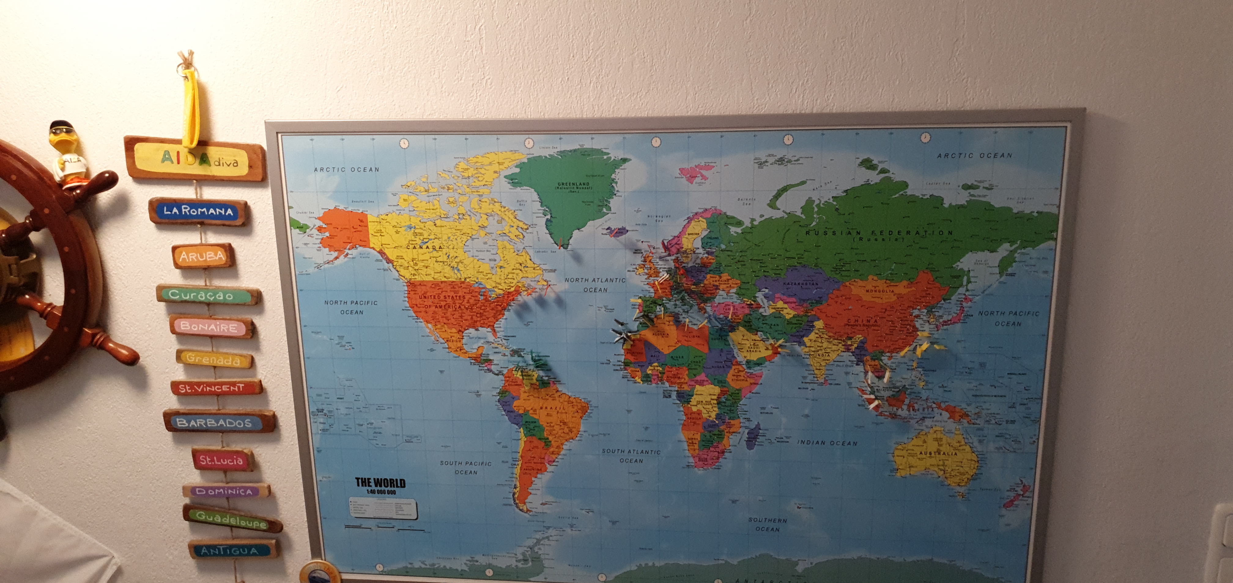 Fähnchen machen sich auf der goldenen Karte nicht so gut.Die Weltkarte ist ein großer Aufkleber