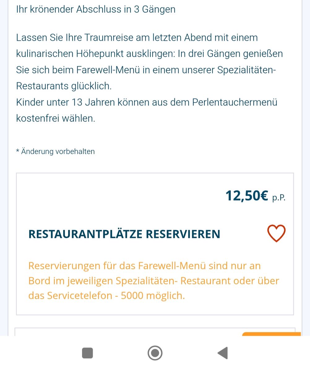 Und ich vermute, dass der Light Tarif ein Test ist wie bereit die Paxe sind zusätzliche Kosten zu zahlen. Da werden durch den Preis Anreize geschaffen zu buchen und dann wird ganz genau auf die Bord Rechnung geschaut was als zusätzliche Kosten alles gebucht wird... Als Anzreiz zahlt man auf den ersten Blick etwas weniger... Am Ende wird aus einem Teil der Spezialitätenrestaurants ein Zuzahlrestaurant werden... Es gibt ja jetzt auch am letzten Reisetag ein kostenpflichtiges 3 Gänge…Matzethias6. August 2025 um 09:30 Ich hatte mal als Suchbegriff "Farewell Menü" eingegeben, da hat es mir diese Posts angezeigt.