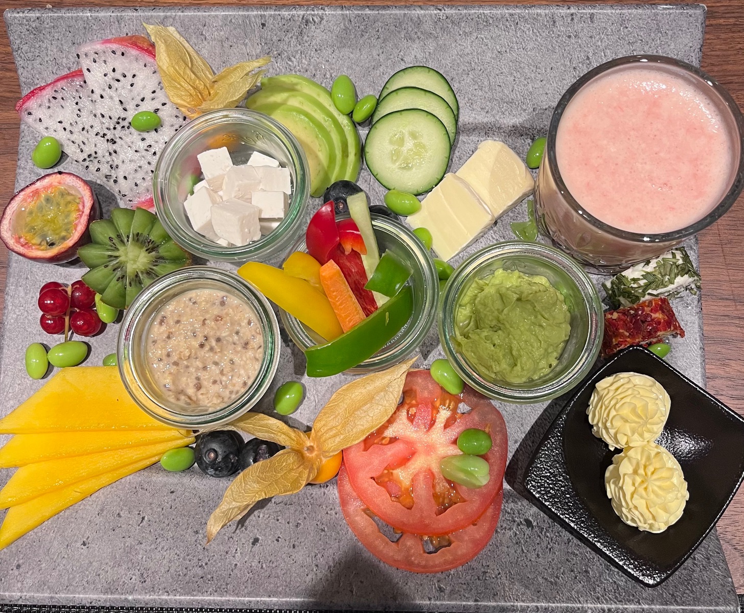 Hallöchen, das Frühstück im veganen Restaurant ist recht gut. Du bekommst ein sehr sehr leckeres bananenbrot 🤤🤤. Frisch werden gemacht :Vegane Waffeln, veganes Rührei mit wahlweise Kräutern, Pilzen oder Tomate. Brot, Brötchen und Flacks (Trockenfrüchte) bekommst du an einem kleinen Buffettresen. Ich habe die Ersatzprodukte Wurst,Fisch und Thunfisch Creme weggelassen. Den rest siehe Foto.