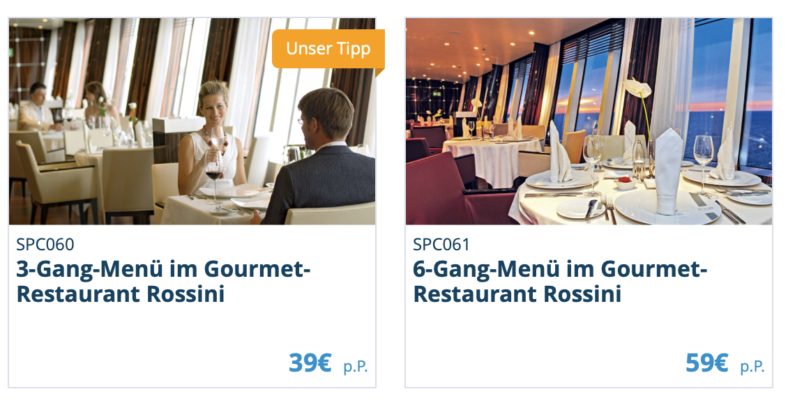 Im Steakhouse gibt es m.E. noch die Möglichkeit, nur einen Tisch zu reservieren, während man im Rossini nur noch gegen Vorkasse (3 oder 6 Gänge) einen Tisch reservieren. Bei der o.g. Luna-Reise fehlt beispielsweise auch noch die Sushibar und das Gourmetfrühstück. Vielleicht kommt da noch etwas....