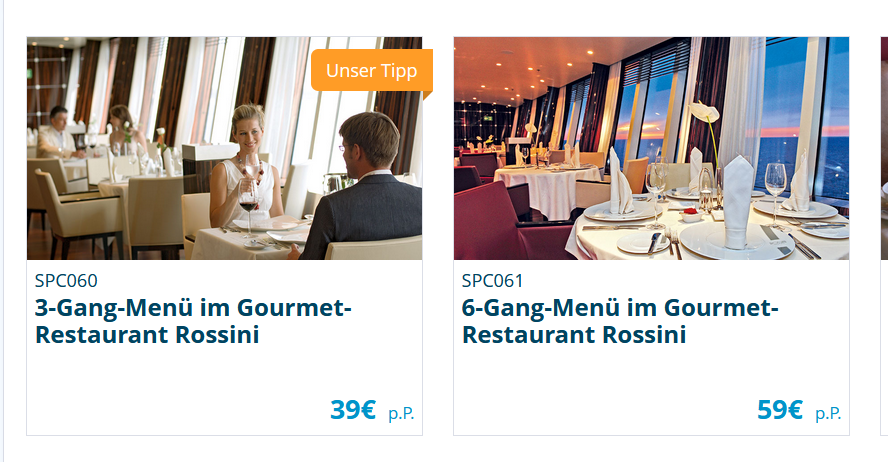 Im Rossini können sie so verfahren, da man dort zwischen Menüs wählt. Im Steakhouse ist das schwieriger, da liegt der Fokus auf a la carte. Hier kann man also weiter einen Tisch reservieren, aber Aida versucht trotzdem durch die Möglichkeit des Menüs, den Umsatz vorarb zu generieren.