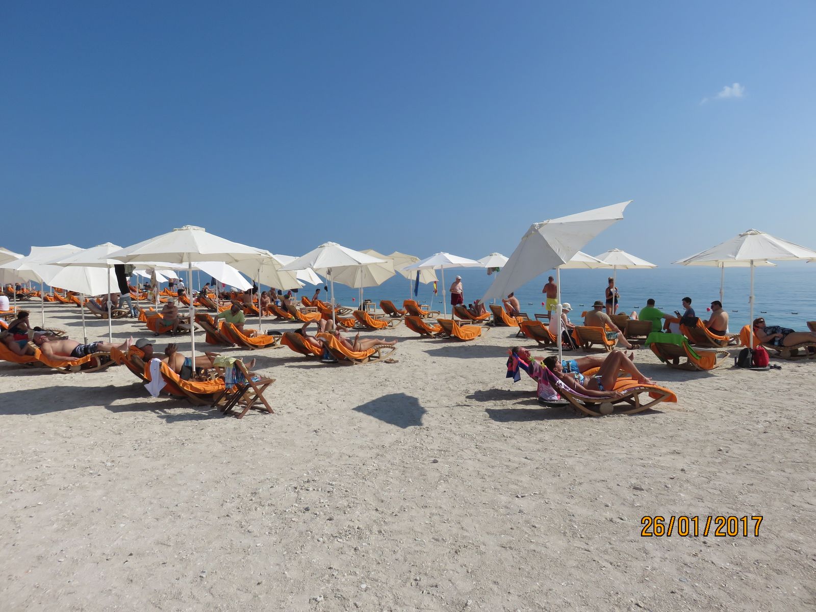 Ich war dort 2017. Was den Strand betrifft, war ich sehr enttäuscht. Es ist kein Sandstrand wie wir ihn kennen, sondern er sah eher aus wie Betonestrich im Sack. Zieht also Schuhe an, auch im Wasser, denn dort gibt es viele unangenehme Steine. Schatten ist dort auch Fehlanzeige. Wer keinen Sonnenschirm mehr bekommen hat, hat schlechte Karten.