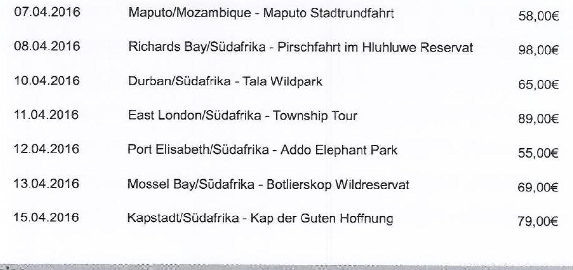 Denn Preis habe ich vorher wie nachher als sehr sportlich angesehen. Das geht bei einem Fremdanbieter billiger. Dazu muss ich aber anmerken, dass hier unser Einreisehafen in Südafrika war. Durch die Buchung eines Aidaausfluges wird man recht flott durch die "Einreisezeremonie" geleitet. Aus meiner Erfahrung selbiger in Namibia ohne gebuchten Aidaausflug, weiß ich, dass es dann ewig dauert. Die Aidaausflugsgruppen werden ständig vor einem hineingeschoben.