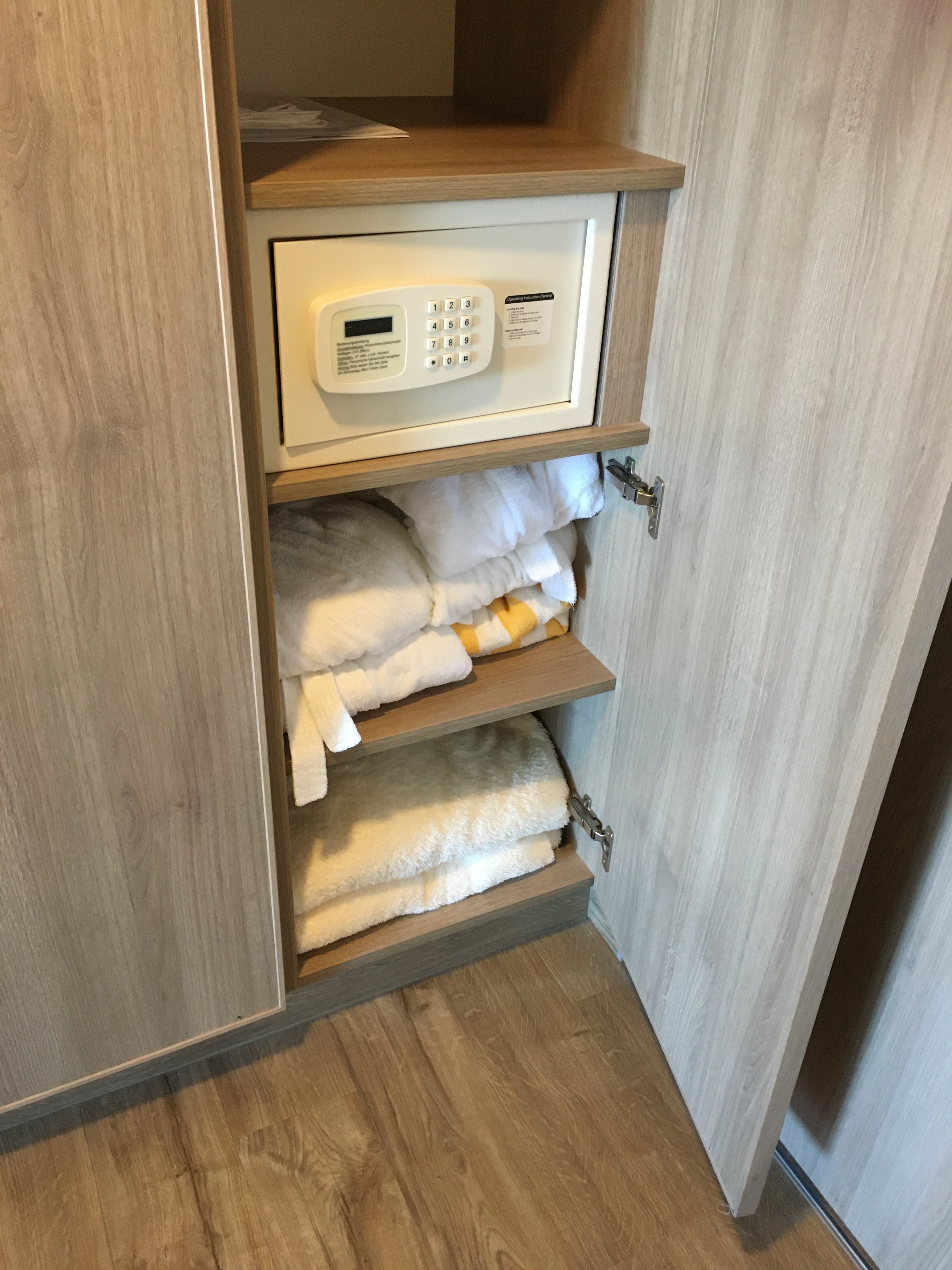 Die Kabine wirkt zwar etwas kleiner als auch Prima/Perla, doch scheint sie gut geschnitten zu sein. Wir reisen auch immer zu viert, was hier geschickt gelöst ist. Bei zwei geschlossenen Seiten an den Einzelbetten könnten wir uns einen Teil der Bettgitter sparen.