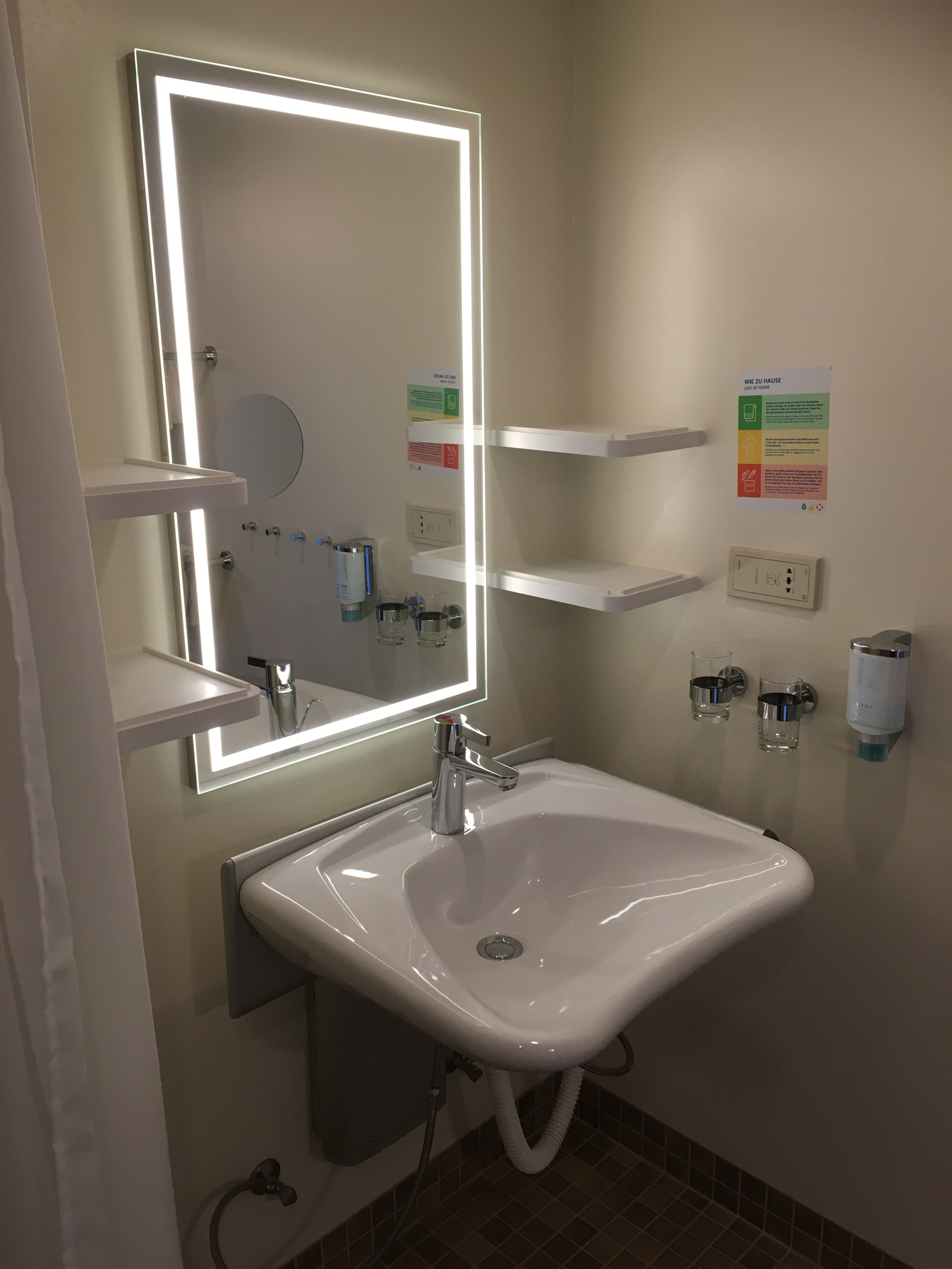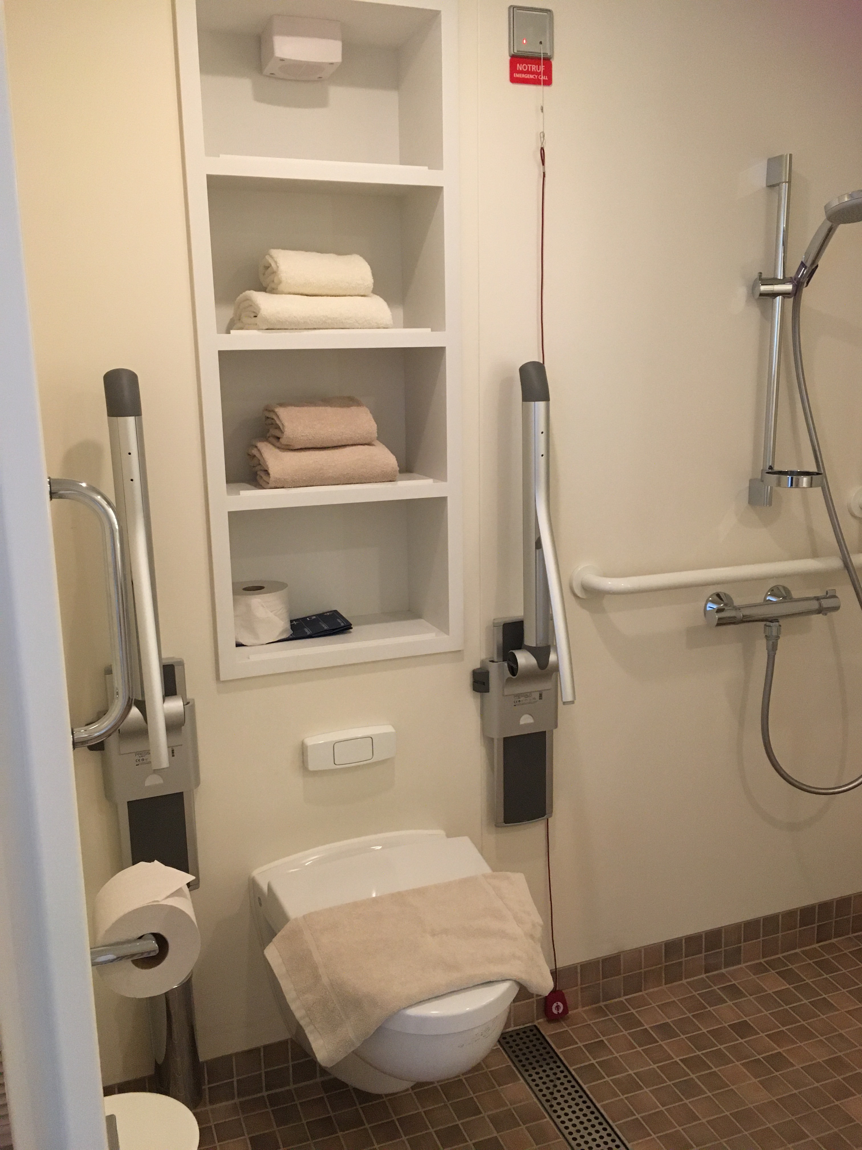 Das Regal haben wir genutzt für Badetücher, Inkontinenzmaterial etc, doof war dass alle Haken unten sind in Rollihöhe und die bademäntel auf dem Boden hängen weil zu nieder, hohe Haken im Bad gabs keine.