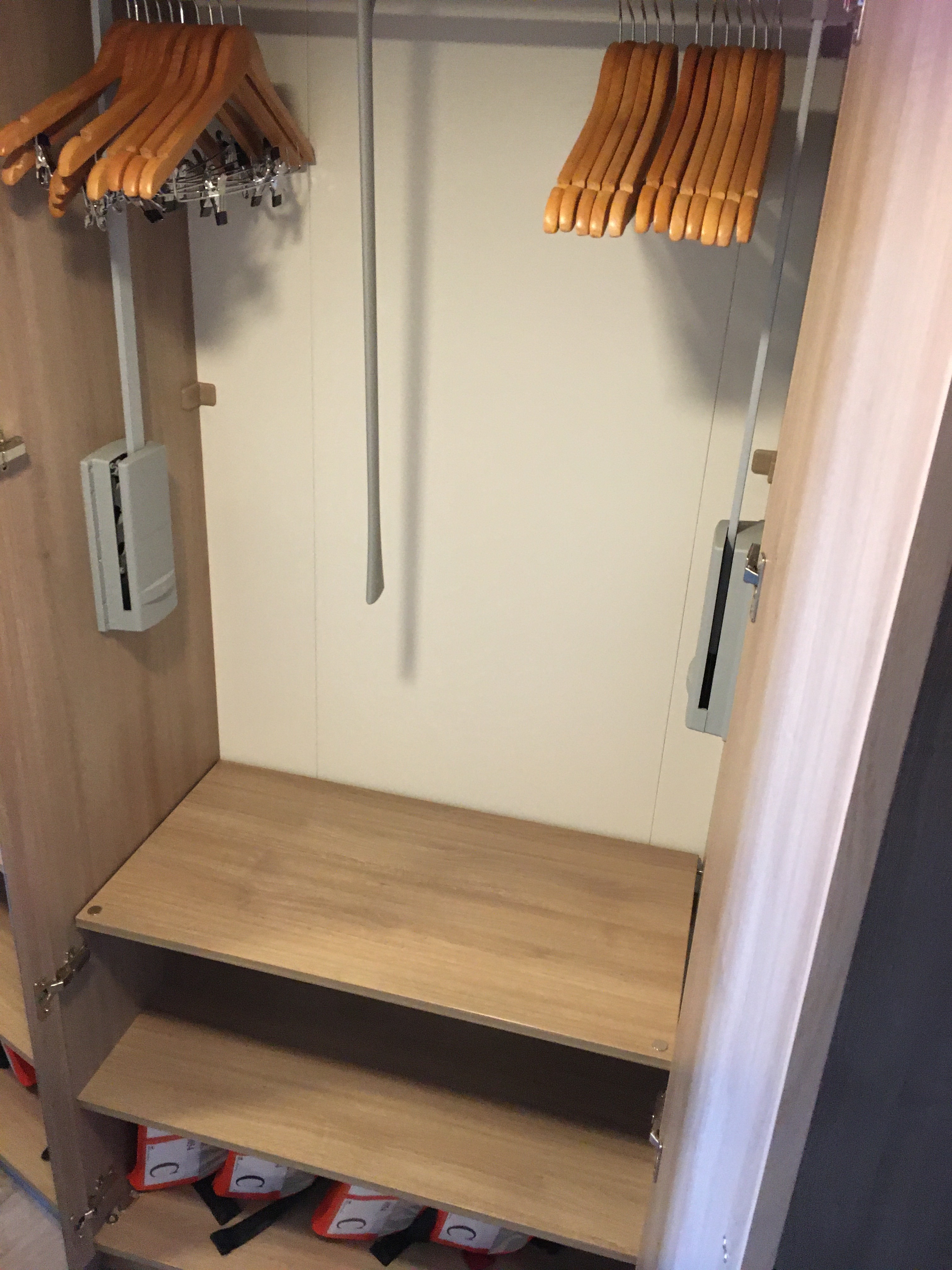 Schreibtisch wie üblich mit TV drüber, Regalfächer und Kleiderschrank ( zu viert recht knapp) mit ausziebarer Stange.