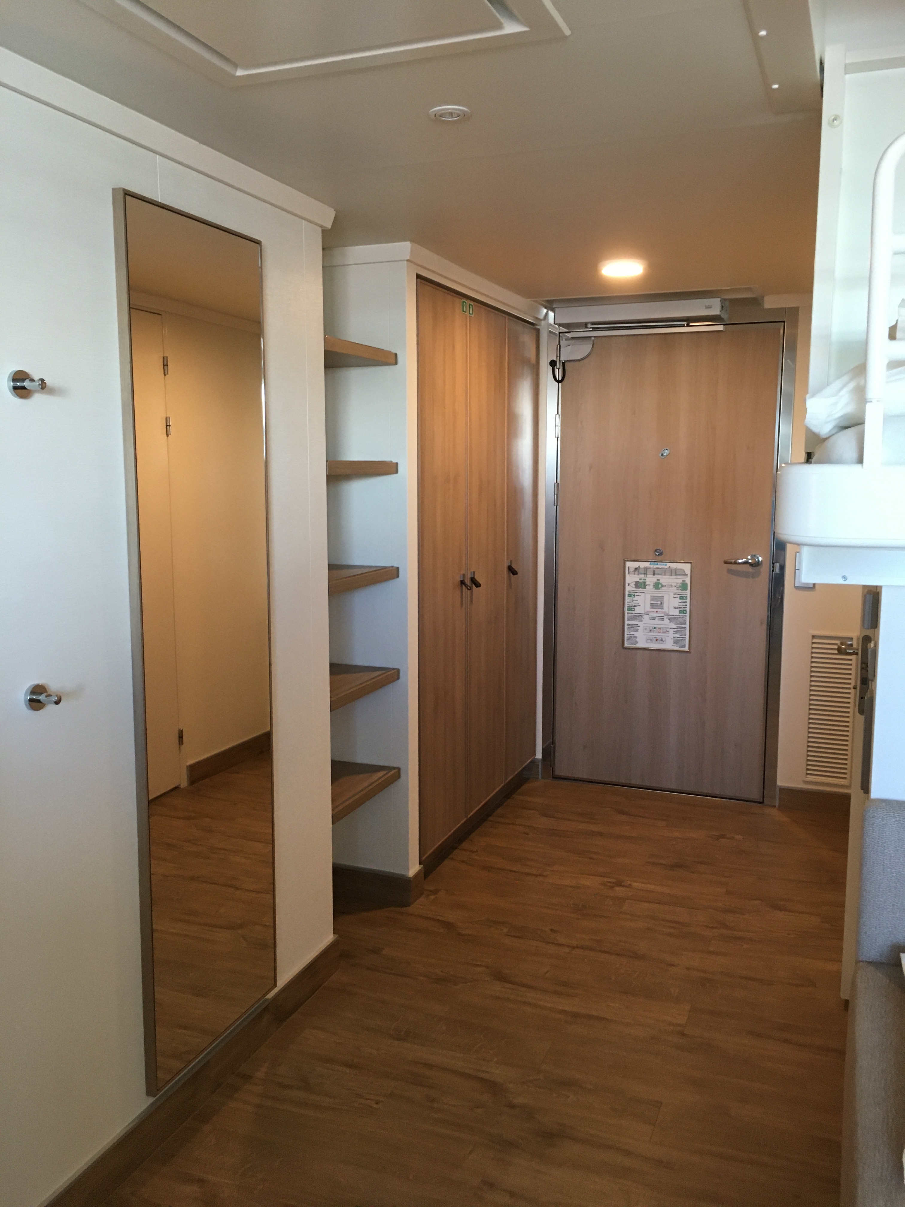 Die Kabine wirkt zwar etwas kleiner als auch Prima/Perla, doch scheint sie gut geschnitten zu sein. Wir reisen auch immer zu viert, was hier geschickt gelöst ist. Bei zwei geschlossenen Seiten an den Einzelbetten könnten wir uns einen Teil der Bettgitter sparen.