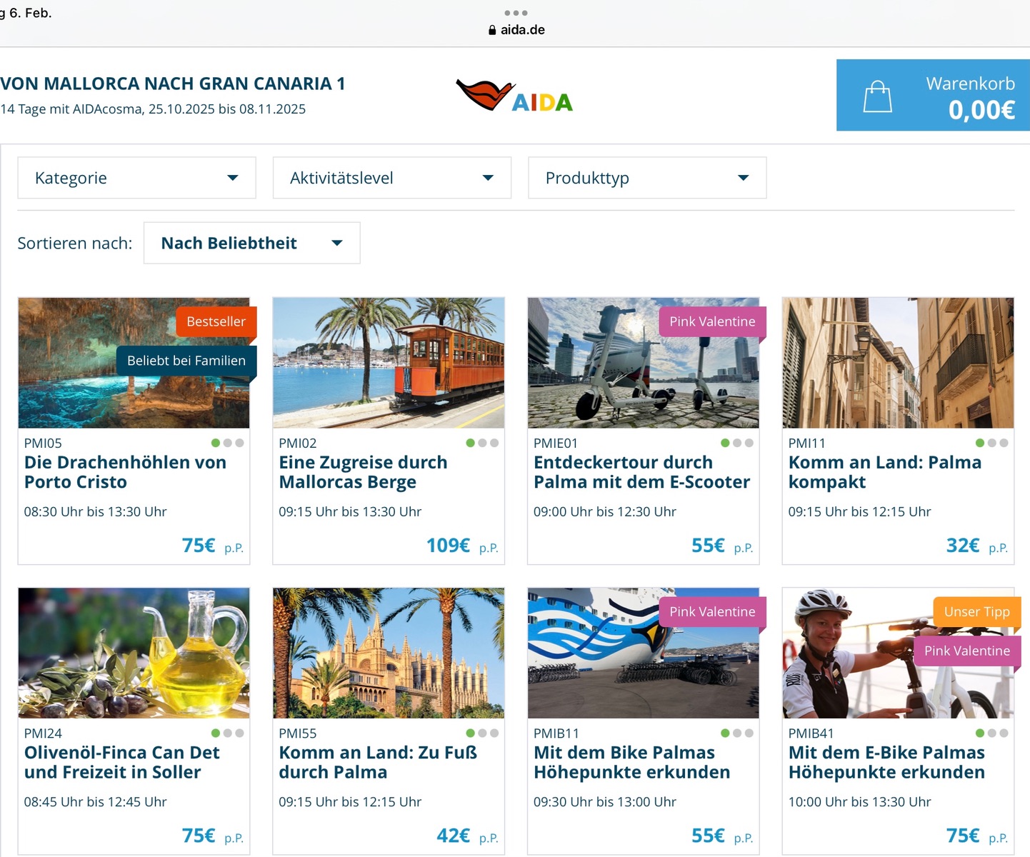 Jetzt stehen alle Angebote mit dem "Pink Valentine" Button unter einem extra Punkt unter Gutscheine und Erlebnisse in My Aida. Also auch Massagen, Rossini, etc. und nicht mehr nur Ausflüge. Aber eine Preisreduktion kann ich bisher nicht erkennen.![]()