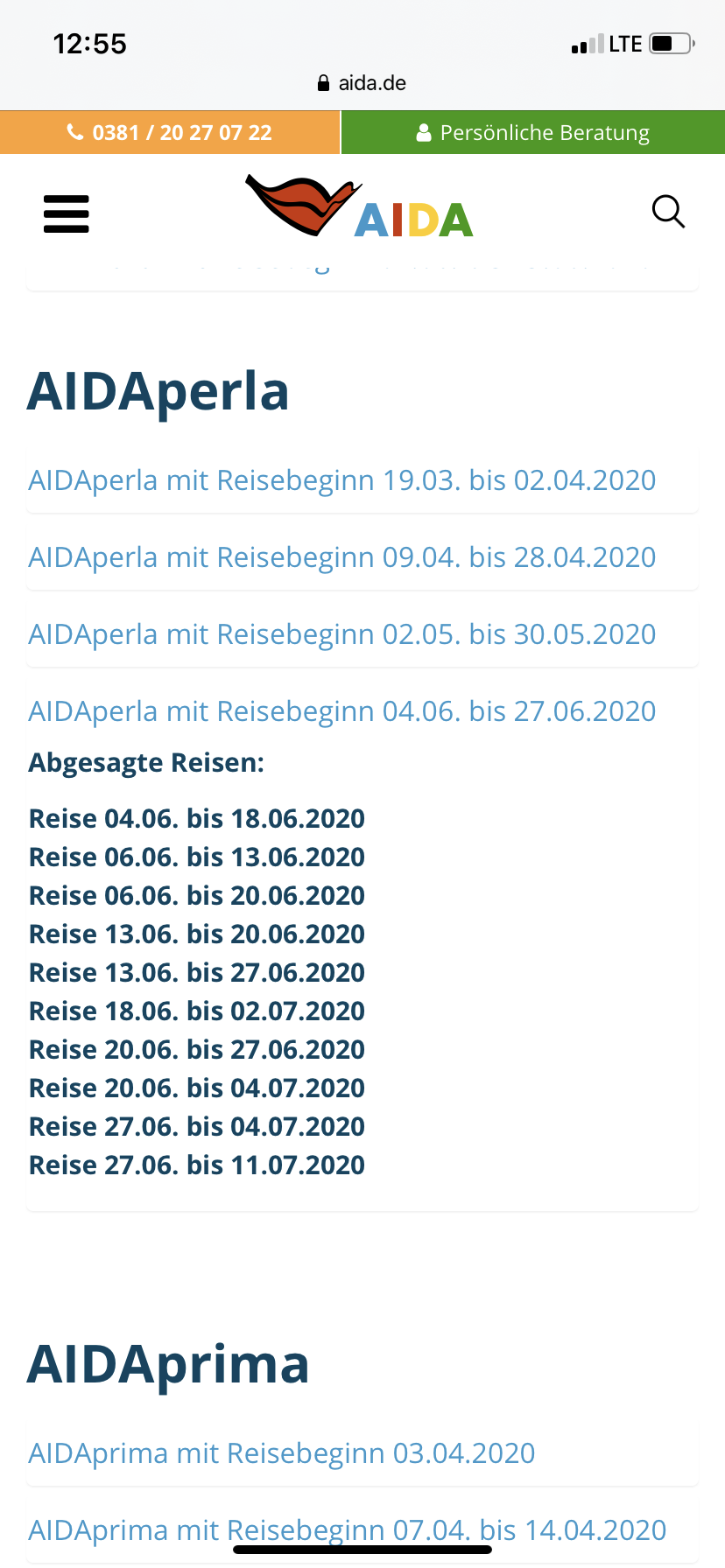 Interessant. Jetzt nach 16Uhr hat AIDA den Eintrag von der Perla 27.06. bis 11.07.2020 entfernt. Nun sind nur noch die Reisen bis 27.06. betroffen.