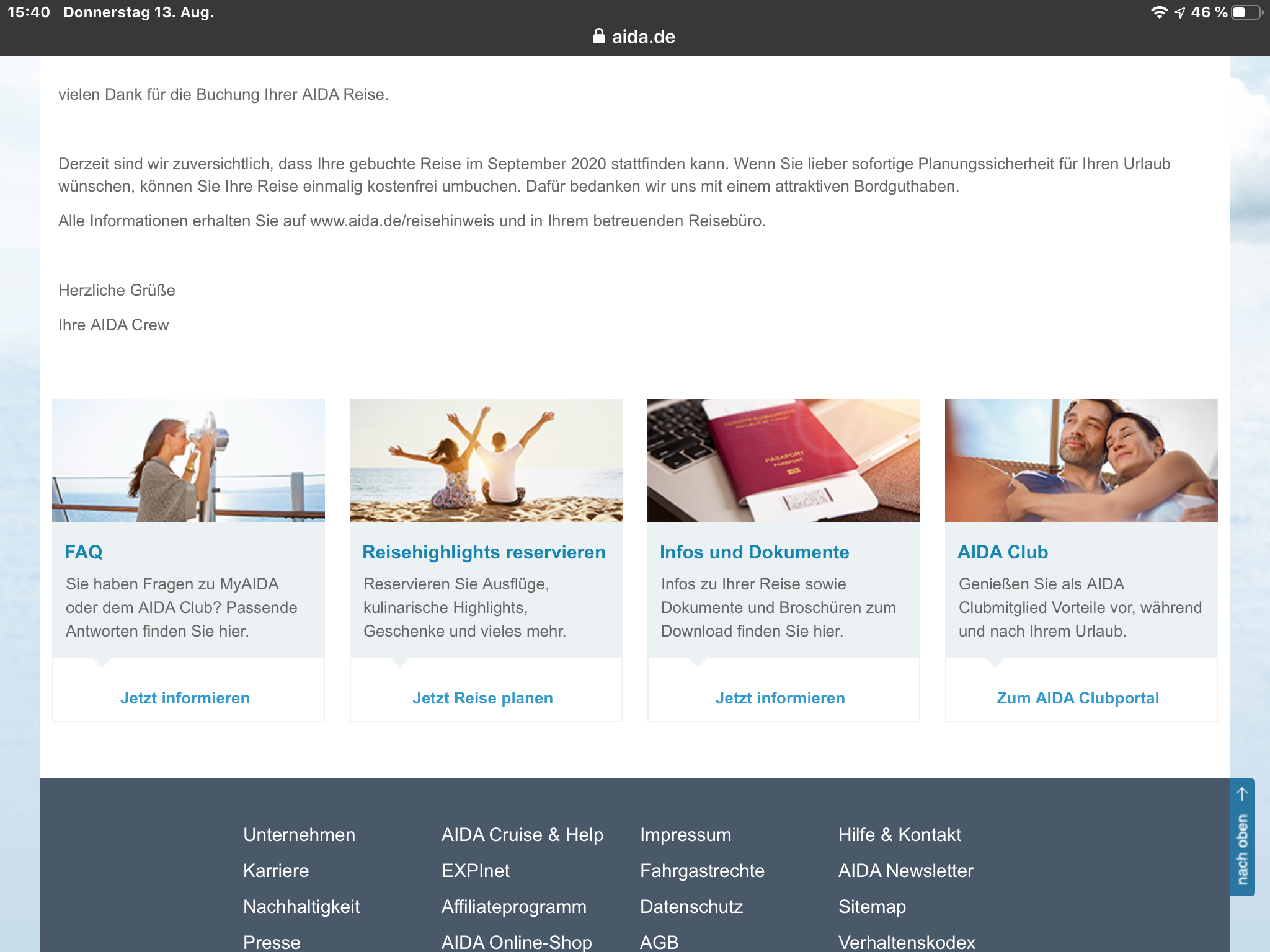 Es ist geltendes Recht bei Pauschalreisen, dass eine wesentliche Änderung der Reise zu einem kostenfreien Reiserücktritt des Reisenden berechtigt. Die Gerichte streiten im Zweifelsfall, was eine wesentliche Änderung ist. Aber wenn eine Kreuzfahrt nunmehr entgegen der Buchubgslage ohne Hafengangmöglichkeit stattfindet, dürfte das kein Zweifel sein, zumal es schon Entscheidungen gibt, in denen nur 3 Häfen geändsrt/weggefallen sind. Bitte mal googlen. Und bei Aida steht das m. E. in den AGBs auch. Früher stand es mal unter 4.2 der AGB. Aber selbst wenn es dort nicht mehr steht, sind sie diesbezüglich ans BGB gebunden, da die Reisen als Pauschalreisen (auch wenn man individuell anreist) gelten.