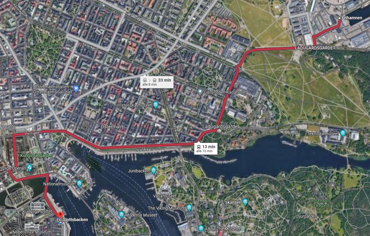 . Und dann Bus 76 in Richtung Norra Hammarbyhamnen nehmen, der fährt ca. alle 15 Minuten und bringt euch zu den touristischen Sehenswürdigkeiten, also Djurgaden oder auch nach Gamla Stan, also die Altstadt. -