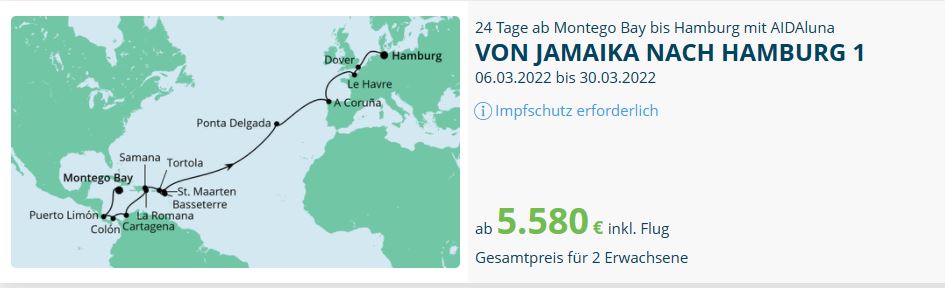 AIDAluna: Von Kiel nach Jamaika | 27 Nächte | 18.10.2021 bis 14.11.2021 (Montag, 18. Oktober 2021, 00:00 - Sonntag, 14. November 2021, 00:00)