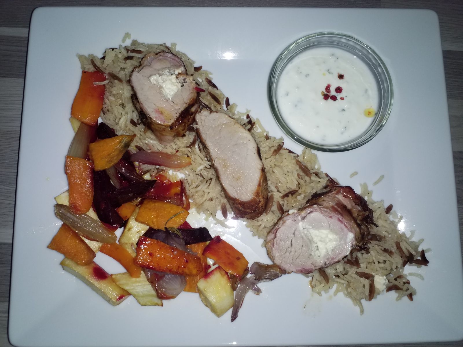 Der Reis ist das Beste.... Klar Schweinefilet mit Feta gefüllt und Baconmantel.. angegrillt und mit BBQ Soße glasiert ist nett... aber der Reis ist echt mjam...