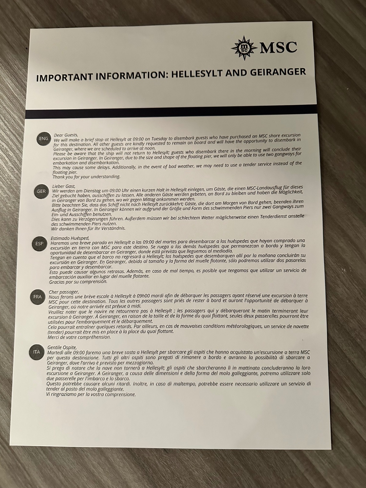 Also ich hab Urlaub, da muss ich keinem 5-15 Minuten zuhören,der mich weiterbilden möchte. Ich hab da mal eine Frage bekommen…..ich hoffe du hast sie dem auch beantwortet und nicht 6000 Passagieren erzählt. Wichtige Informationen bitte ja; Weiterbildung bitte nur in der nautischen Stunde…weil sonst hört halt keiner Zu wie es aktuell ist. Das stört am Ende alle.