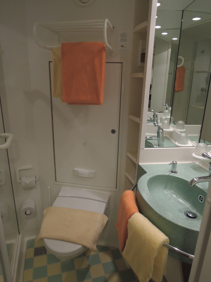 Super gut gelegen und eine sehr geräumige Kabine! Tür auf und man steht direkt vor dem Wasserspender! Zwei Schritte weiter ist rechts der hintere Fahrstuhl und links das Aussendeck über welches man dann auch relative schnell zur Oceanbar kommt!