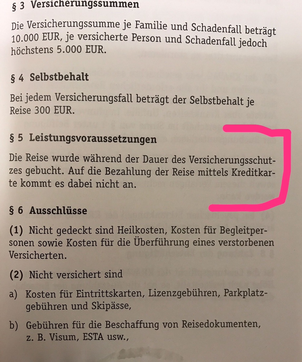 Bei meiner Kreditkarte ("Mastercard Gold von Miles&More") muss die Reise zwingend mit der Karte reserviert/angezahlt/bezahlt werden.