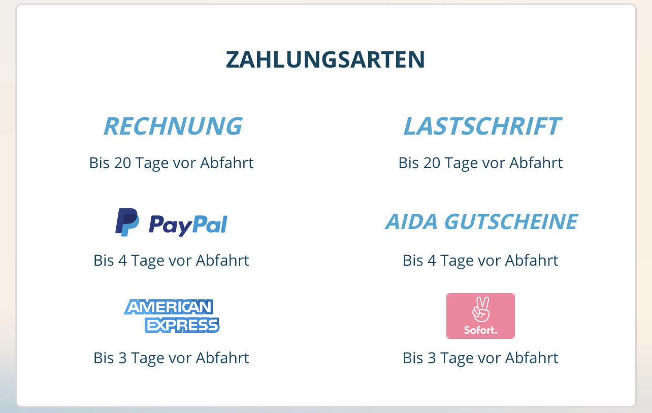Paypal geht bis 4 Tage vor Abreise (siehe neue Angabe in MyAIDA).