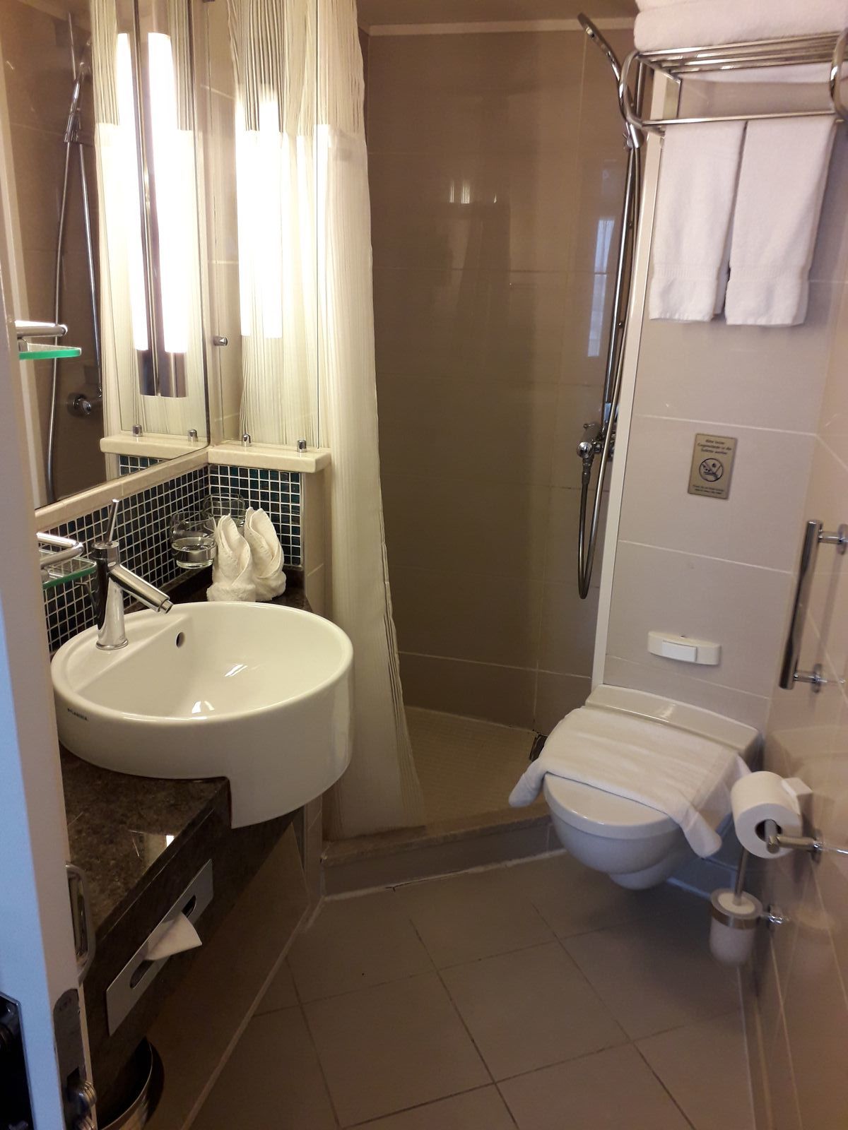 ich hab hier ein Foto einer "Nasszelle" einer Balkonkabine, "negativ" waren für mich die knapp kalkulierten Ablagen, insbes. am Waschbeckenbereich, und eben der Duschvorhang, aber ich konnte gut duschen ohne den Vorhang am Körper zu haben. Entschädigt wurde ich durch den begehbaren Kleiderschrank (das hatte ich vorher noch nie).