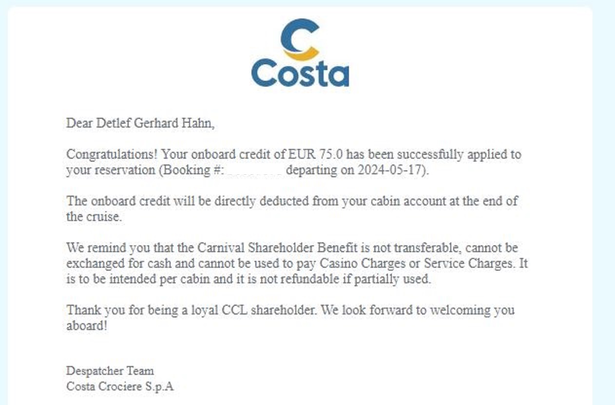 Ich bin ab dem 17.5. mit COSTA unterwegs und habe einen Kontoauszug vom 25.3. abfotografiert und mit der App weggeschickt. Gestern erhielt ich von no-reply@stockperks.com die beigefügte Antwort, dass das Bordguthaben genehmigt wurde. Bei myCosta habe ich es allerdings nirgendwo gefunden