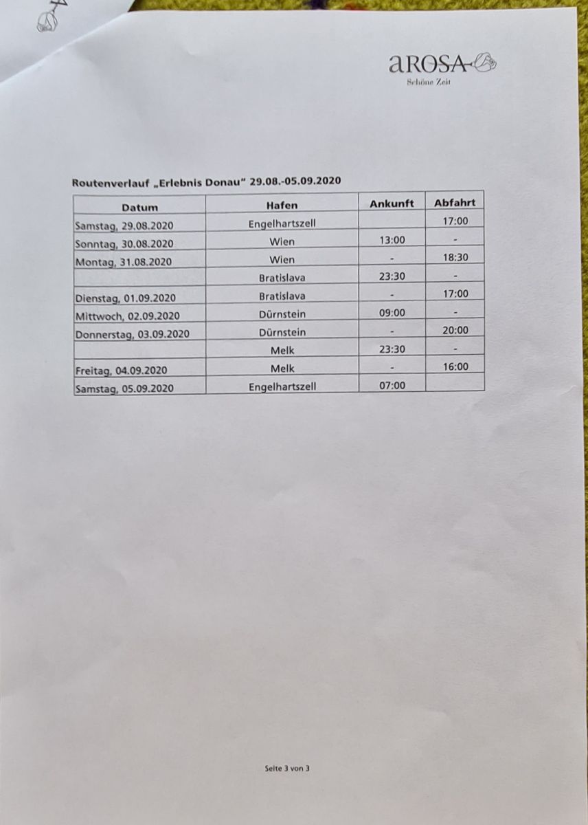 Wir hatten auf der Donau Delta Tour genau den gleichen Brief bekommen, nur Seite 3 war eine andere. Das ist die Masche von Arosa. Vorher nichts kommunizieren, und erst nach dem anreisen, einchecken und Koffer auspacken, also kurz vor Abfahrt wird erst die "kurzfristige" Routenänderung mitgeteilt. Eben damit man auf die schnelle nicht abbrechen kann und antreten muss.