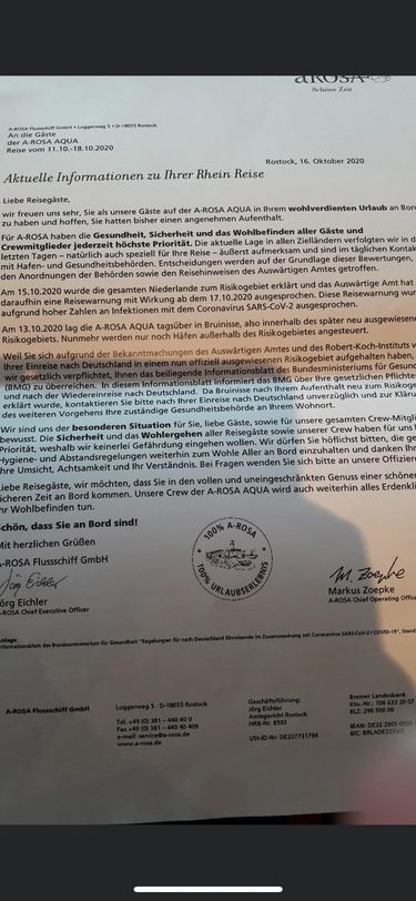 Da jetzt in Österreich bis auf Kärnten alle Bundesländer ein Risikogebiet sind sollte A-Rosa endlich die Reißleine ziehen und entweder auf deutsche Häfen umrouten (schlechtere Alternative, da z.B. auch Passau ein Risikogebiet ist) oder gleich ganz absagen (wesentlich bessere Alternative).