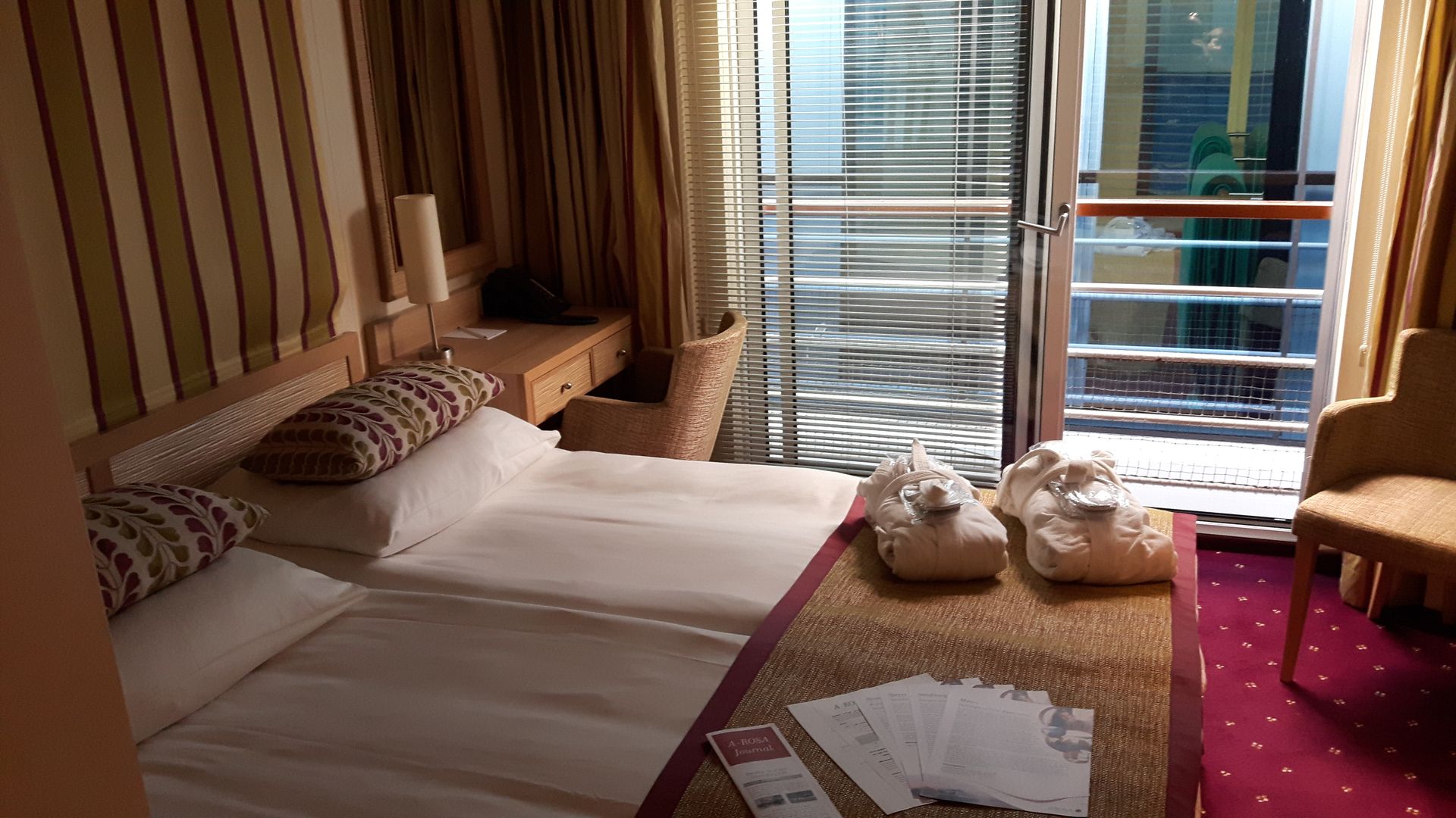 Hier mal einen kleinen Eindruck zur Kabine ( es lag allerdings ein Schiff neben uns ).