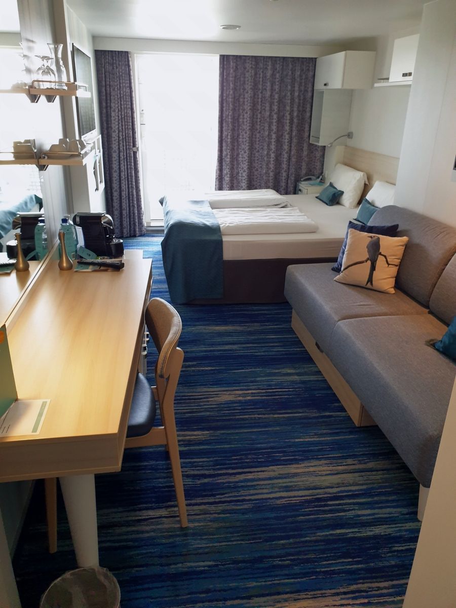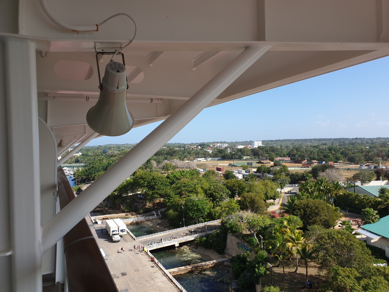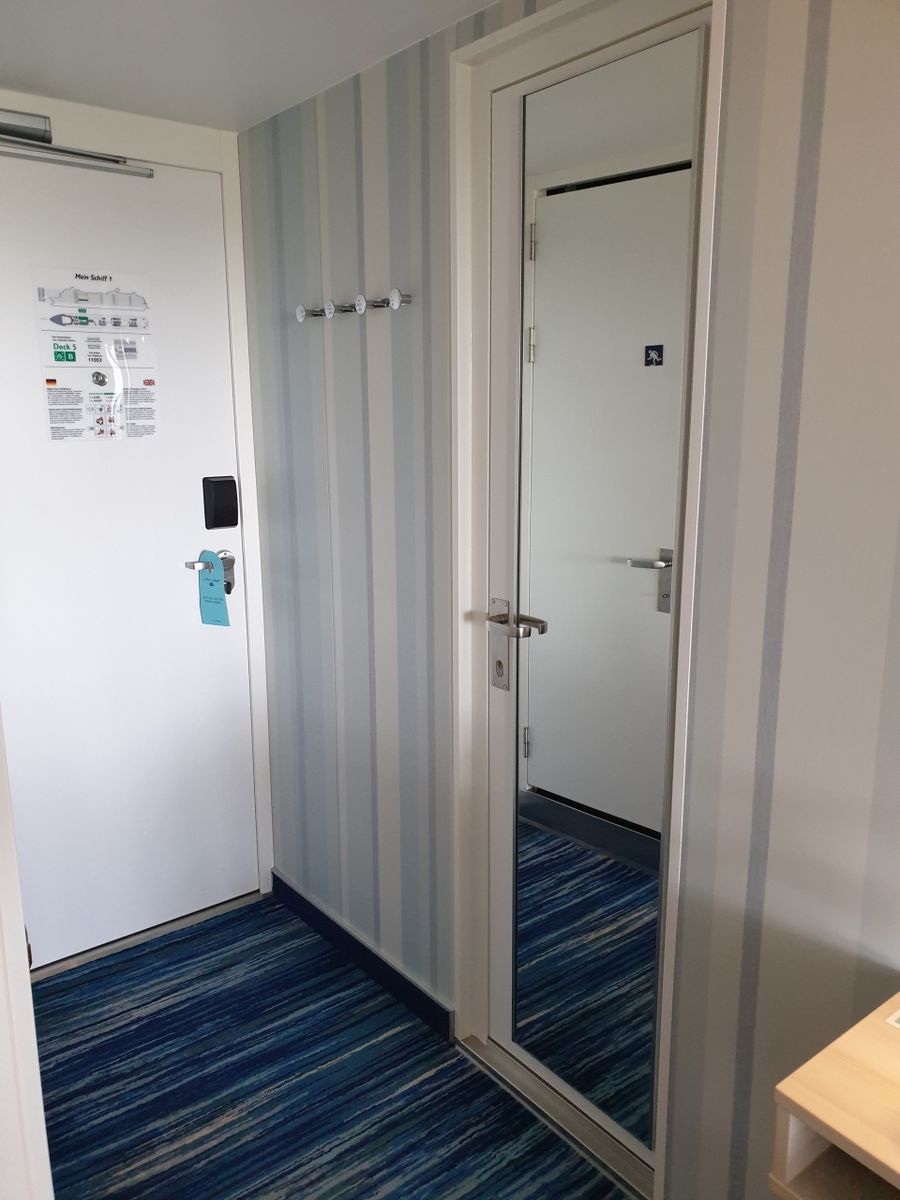 Auf meiner Mittelamerika-Kreuzfahrt im Februar 2020 (youtu.be/nMmmZk4FTVo) hatte ich am letzten Tag noch eine Tageskabine, und zwar die 11053. Grundsätzlich handelt es sich auch hier um eine ganz normale Balkonkabine, allerdings mit Verbindungstür. Ich würde sie aber nicht gezielt buchen, wenn ich wählen könnte, weil sie auf Deck 11 zwei entscheidende Nachteile hat: Da sie direkt unter dem Pooldeck ist, gibt es von dort möglicherweise Ruhestörung durch herumgeschobene Liegestühle (wobei ich persönlich nichts gehört habe, da ich ja nur unter Tag und wenige Stunden an einem An- und Abreisetag mit wenig Gästen an Bord in dieser Kabine war), aber - für mich subjektiv weitaus gravierender - ist sie damit auch direkt unter einem doch sehr ausladenden "Vordach", noch dazu mit Stützstreben (siehe Fotos), was die Sicht meines Erachtens etwas trübt (andererseits aber natürlich auch Schatten spendet bzw Sonne nimmt, je nachdem). Bei Durchsagen etc wird man zudem auch "bevorzugt", weil ein Lautsprecher direkt am Balkon hängt