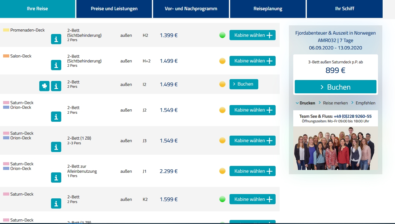 Für Einzelpersonen finde ich das nicht so übersichtlich. Bei der Kabinenauswahl muss ich erst mal gucken welches Deck ich überhaupt buchen kann und da gibts dann auch nicht so viele