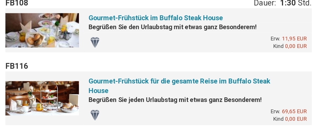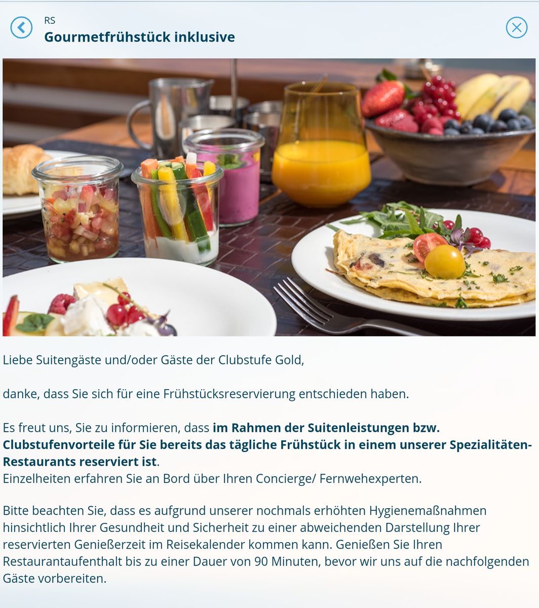 Übrigens, dass man als Gold-Gast das Gourmet -Frühstück nicht buchen kann, da es inklusive ist, stimmt nicht ganz. Bin vor der Mar-Tour auf der Prima und da kann ich für 11,90 pro Tag oder für 69 € für die ganze Woche es buchen, obwohl es auch als Inklusive-Leistung be Tischreservierungen steht.