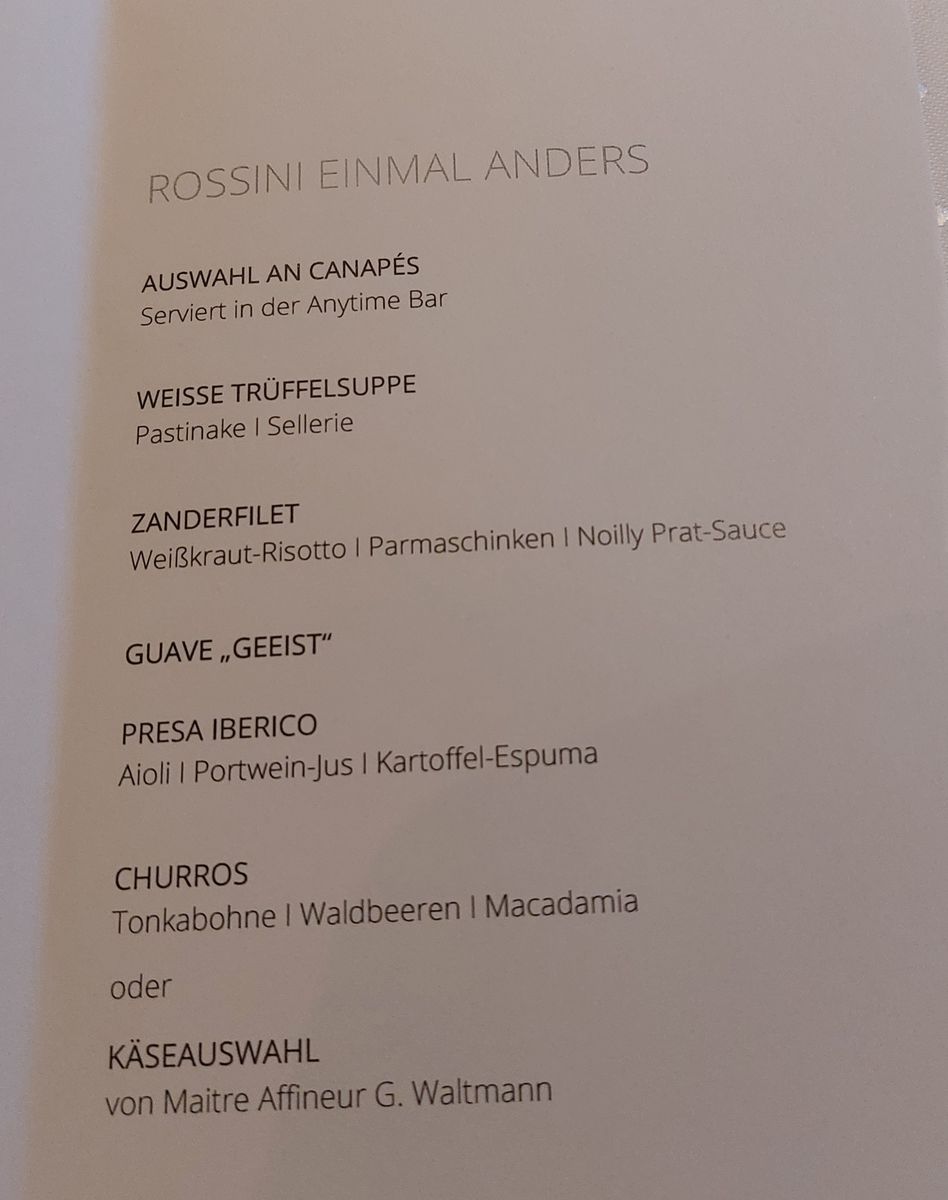 Wie Omu schon sagte 69€ Rossini einmal anders. War es aber wert. Ich bin bisher noch nie im Rossini enttäuscht worden. Egal auf welchem Schiff. Nur die Nörgler die neben uns saßen waren nervig.