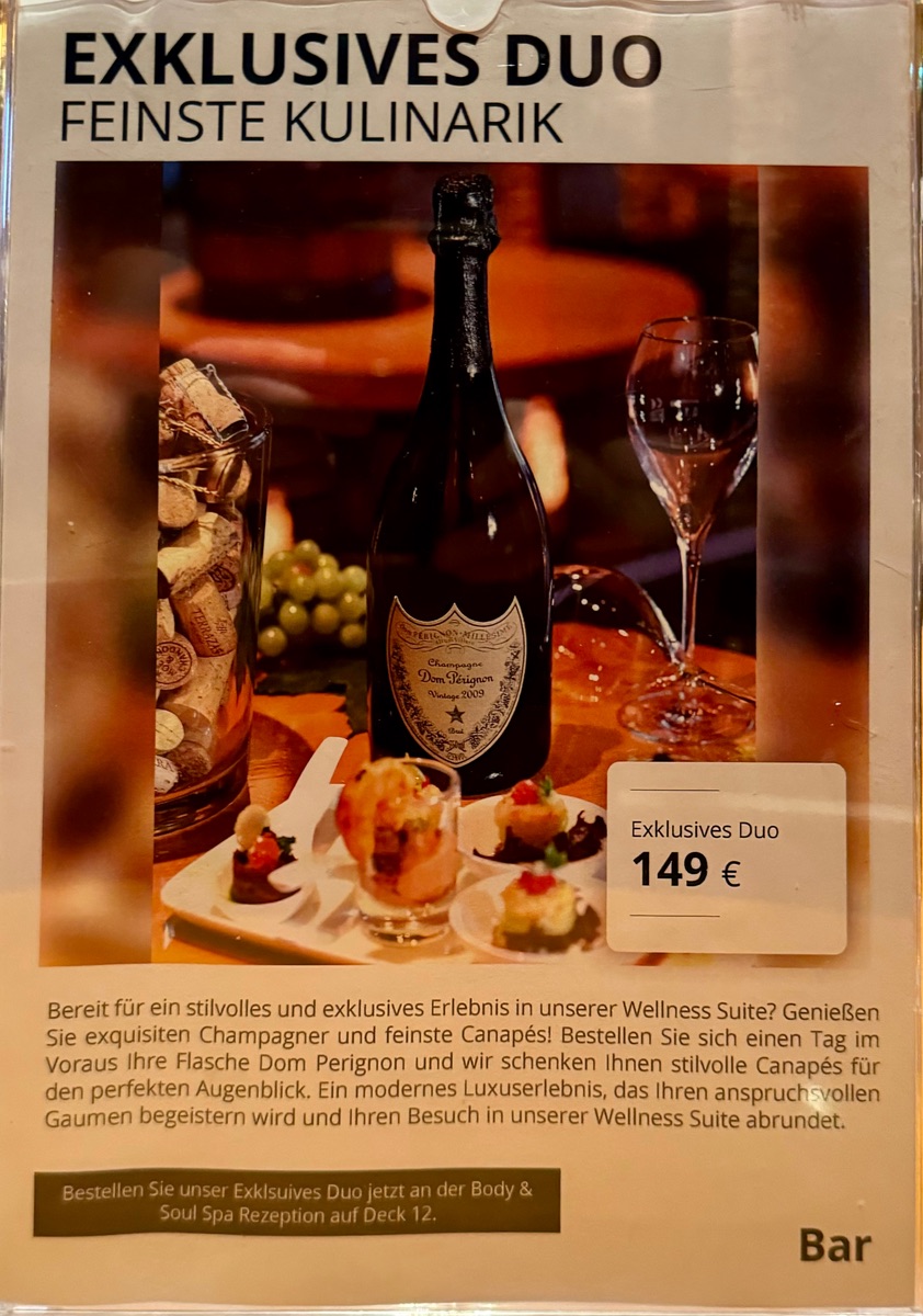 Der Dom Perignon kann zur gebuchten Wellness-Suite dazu gebucht werden. Dazu gibt es auch noch ein paar Häppchen. Anbei der zugehörige Aufsteller… und zurück zum Thema Rossini :)