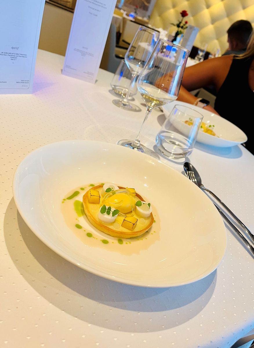Oder umgekehrte Reihenfolge (Dessert im Außenbereich) als "Rossini einmal anders herum". Das hängt von der Ablegezeit ab, so erlebt man (meistens) das Auslaufen mit dem Gläschen Champus in der Hand und nettem Small Talk.