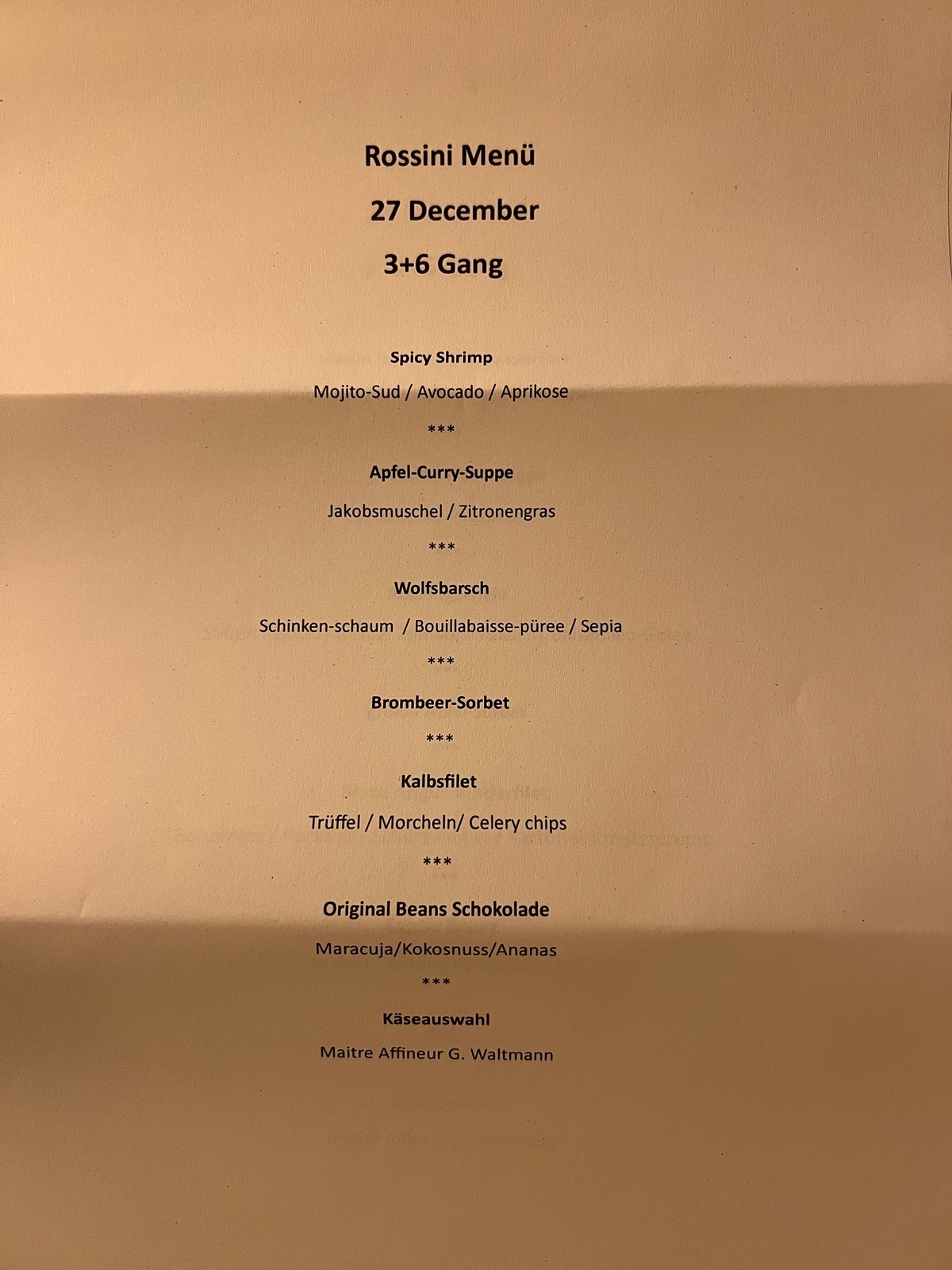 Und der Service…im Rossini meist bemüht aber weit weg von einer Sternegastronomie, fehlende Aufmerksamkeit, Fehler in der Ausführung (von links bedient, nicht nachgeschenkt oder Flasche krampfhaft leer gemacht, Brot nicht nachgelegt oder dann nicht abgeräumt usw.) machen das Ganze mehr zu einem normalen Essen als dem Highlight das es sein könnte.