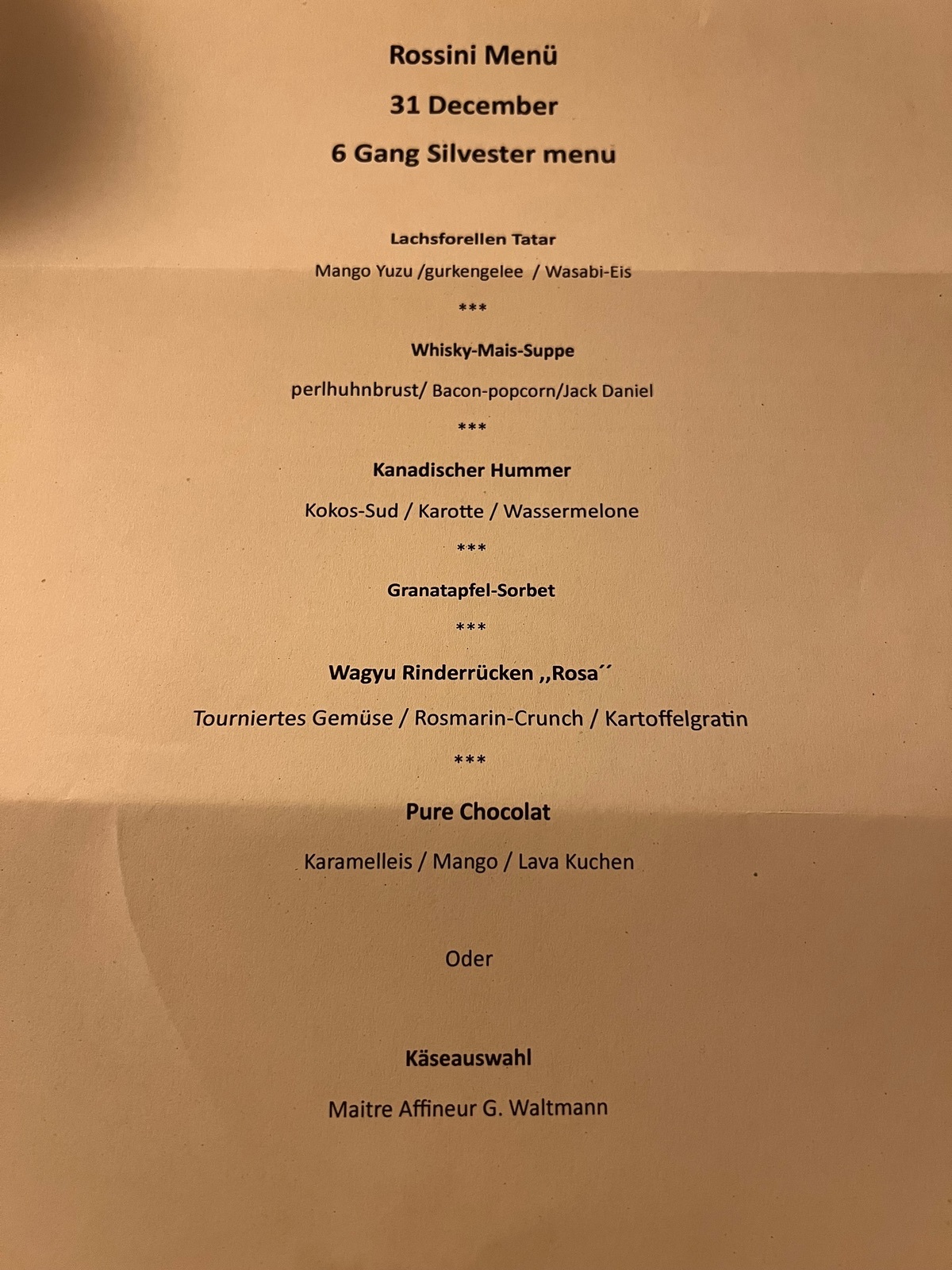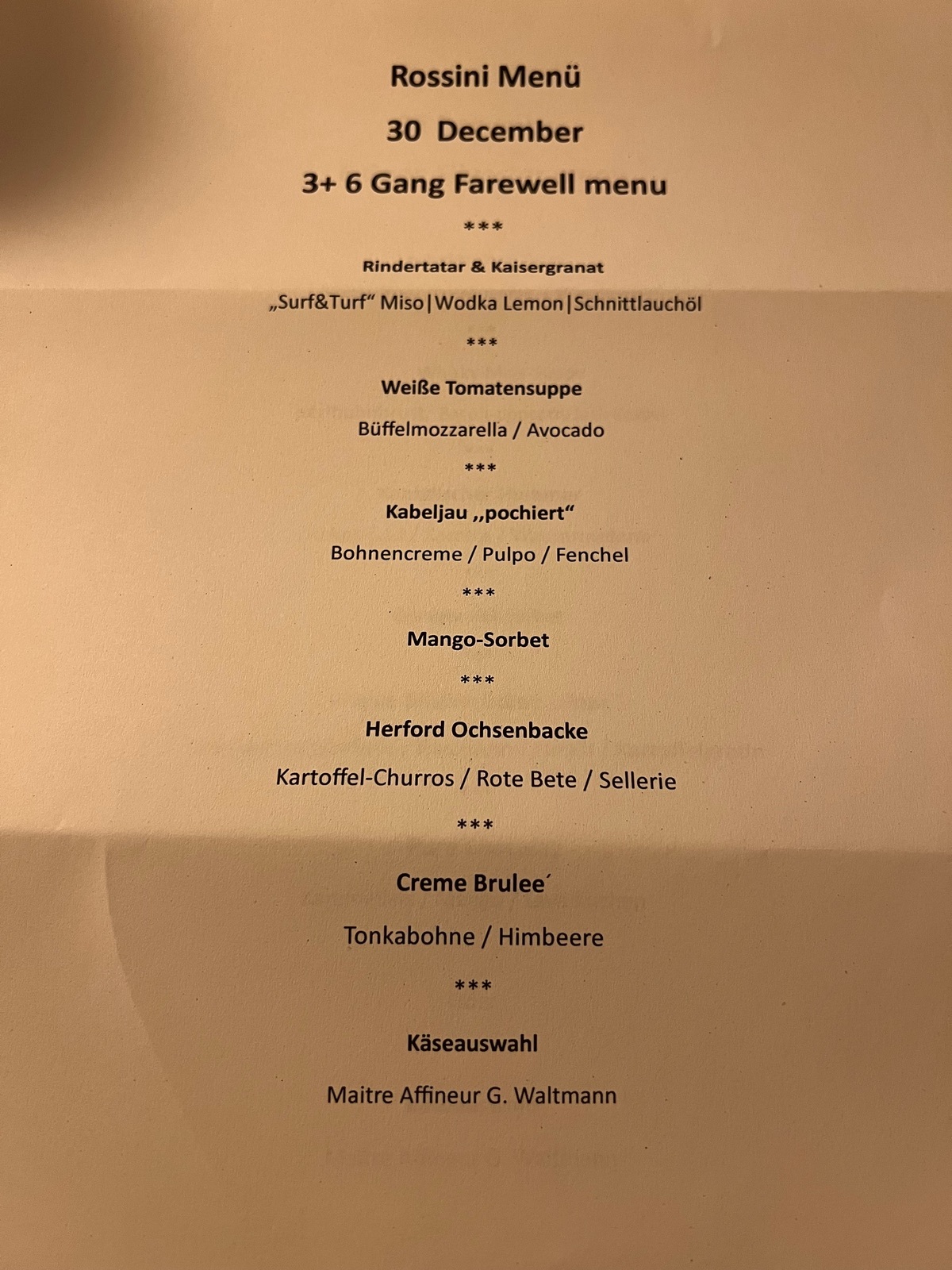Und der Service…im Rossini meist bemüht aber weit weg von einer Sternegastronomie, fehlende Aufmerksamkeit, Fehler in der Ausführung (von links bedient, nicht nachgeschenkt oder Flasche krampfhaft leer gemacht, Brot nicht nachgelegt oder dann nicht abgeräumt usw.) machen das Ganze mehr zu einem normalen Essen als dem Highlight das es sein könnte.