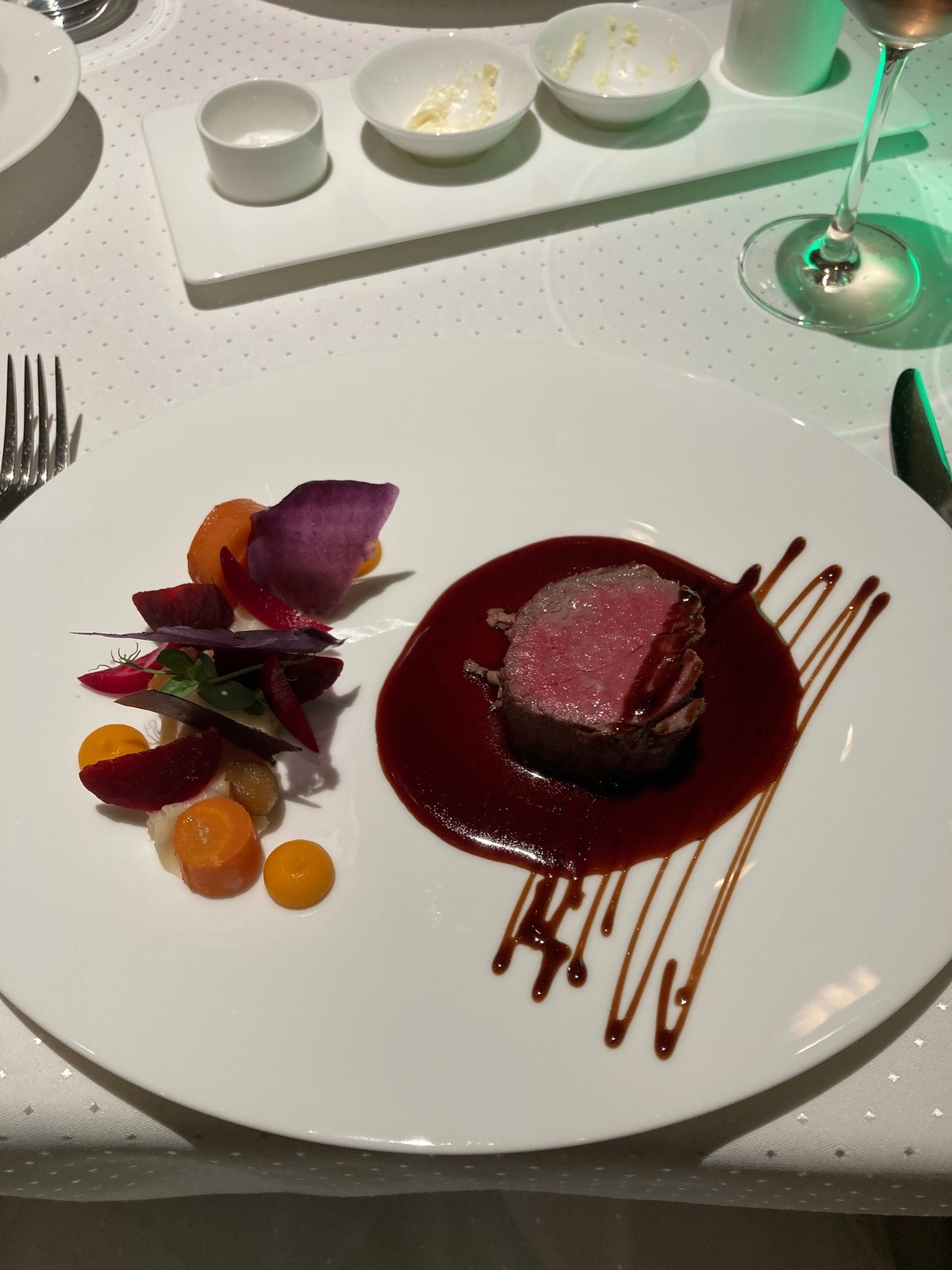 Es war eine eher kleinere Gesellschaft, hatten wir schon voller erlebt. Bei den Canapes am Beginn war es nicht mehr so reichhaltig, die Einzelstücke wurden zugereicht, selbst am 4er Tisch wurde nur widerwillig mal eine Platte komplett hingestellt (mit 4 Stückchen drauf). Die Qualität war auch etwas schwächer, belegte Vollkorn-Schnitten sind nun kein echtes Highlight (für Mini-Smörebröd waren sie auch zu einfallslos).
