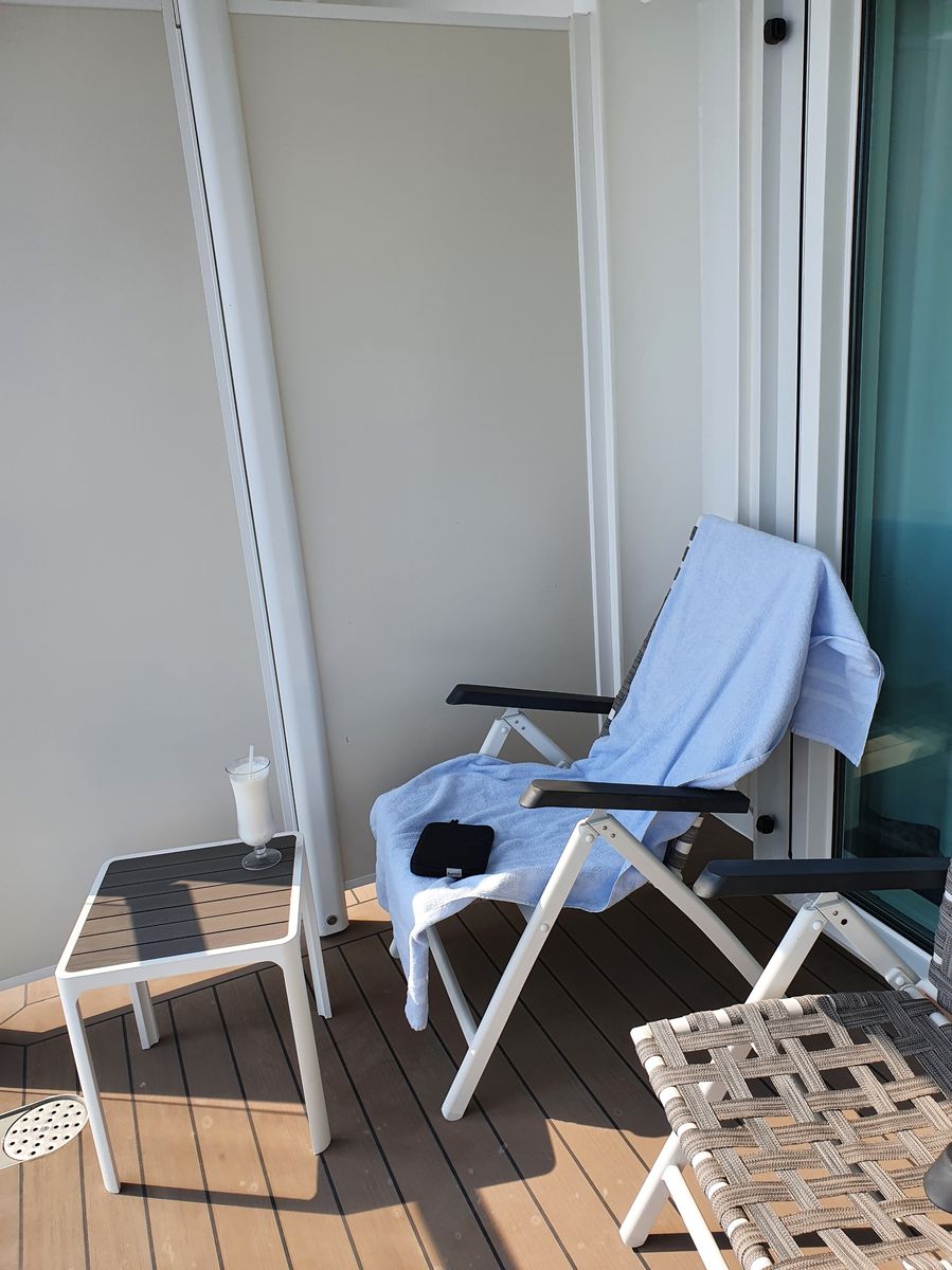 Der Balkon ist auch für 2 groß genug. Es gibt 2 verstellbare Balkon Stühle und einen kleinen Hocker als Tisch