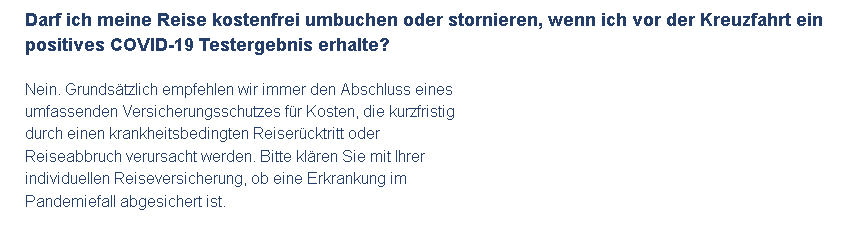 Nach insg. 45 Min. Wartezeit vorm Eingang durften wir zur Anmeldung gehen. Hier wurden die Schiffspässe kopiert, wir mussten die Krankenkassenkarte abgeben und die Datenschutzerklärung unterschreiben. Außerdem war noch ein Zettel "Übergangslösung/Händisches Erfassen von Passagierdaten" auszufüllen. Die Daten, die bereits auf dem Schiffspass standen, brauchten wir nicht ergänzen. Nur den Namen der Klinik, Datum, Uhrzeit und unsere Telefonnummern. Unsere Daten wurden erfasst und wir bekamen jeweils eine Kopie von der unterschriebenen Datenschutzerklärung, der Info zur Verarbeitung personenbezogener Daten sowie von dem Formular "Übergangslösung. Alle drei Kopien versehen mit dem Namensaufkleber. Außerdem bekamen wir noch ein Formular mit "Informationen zur Durchführung von PCR-Tests...." Hier wird die Kooperation mit TU beschrieben, dass man bei einem positiven Test angerufen wird und TUI Cruises sowie das zuständige Gesundheitsamt darüber informiert werden. Mit einem Bogen mit unseren Aufklebern machten wir uns auf den Weg zur Notaufnahme. Von der Schwester an der Anmeldung wurden wir in den Wartebereich verwiesen. Nach ca. 15 Minuten Wartezeit holte sie uns und wir gingen in einen (spärlich möblierten) Raum, wo ein Rachenabstrich gemacht wurde. Dauer ca. 10 Sek. Insg. sind ca. eineinhalb Stunden vergangen, bis wir wieder am Auto waren. X/
